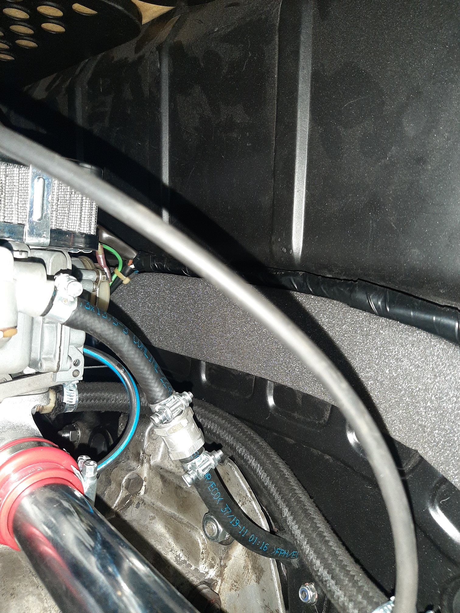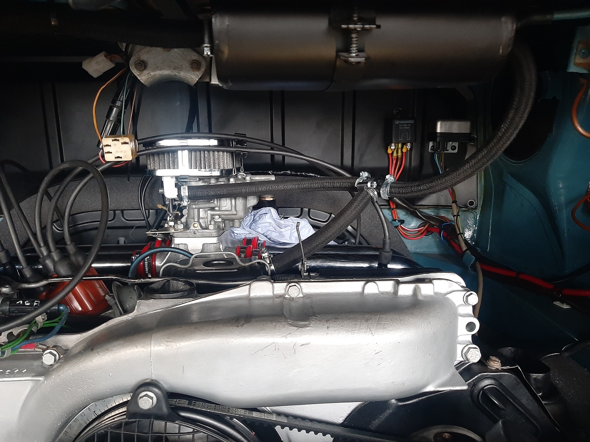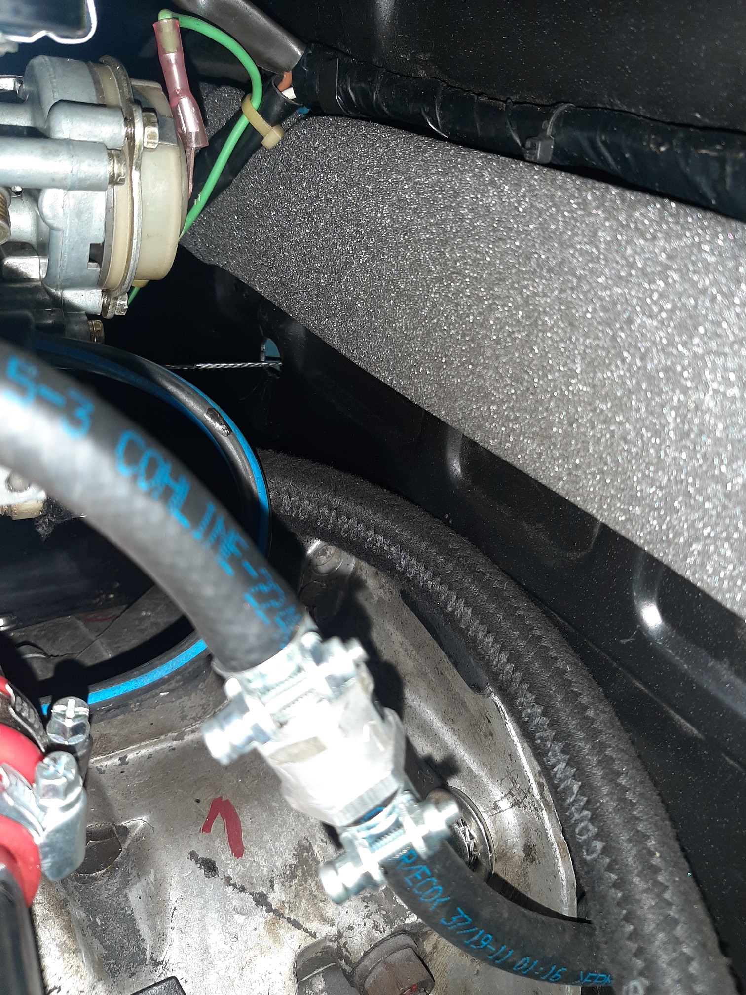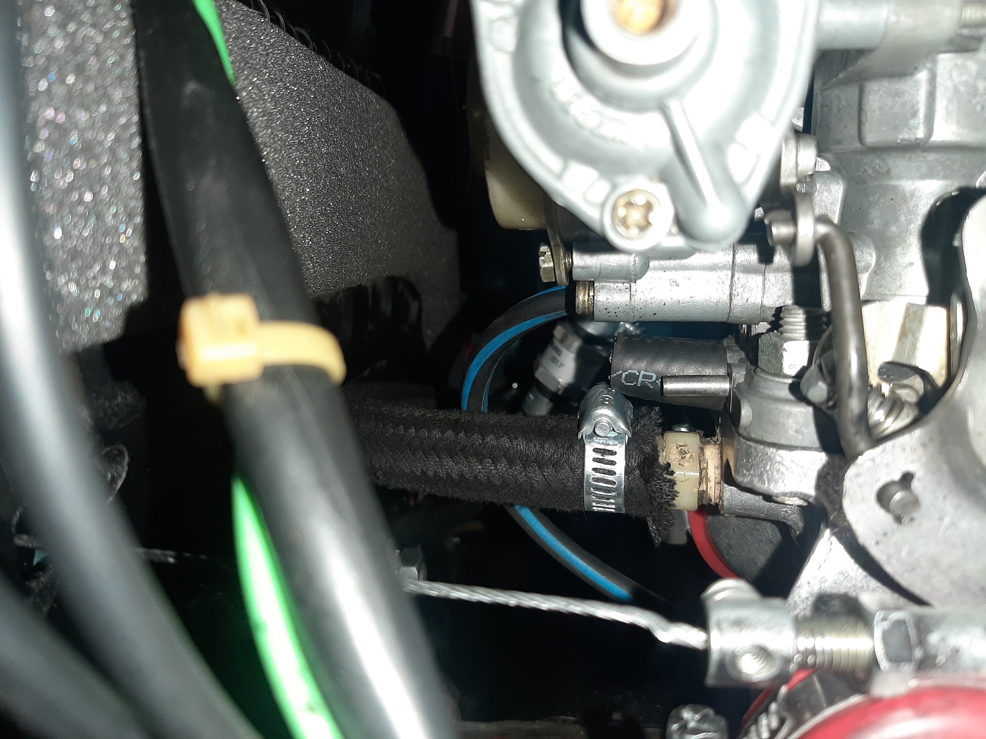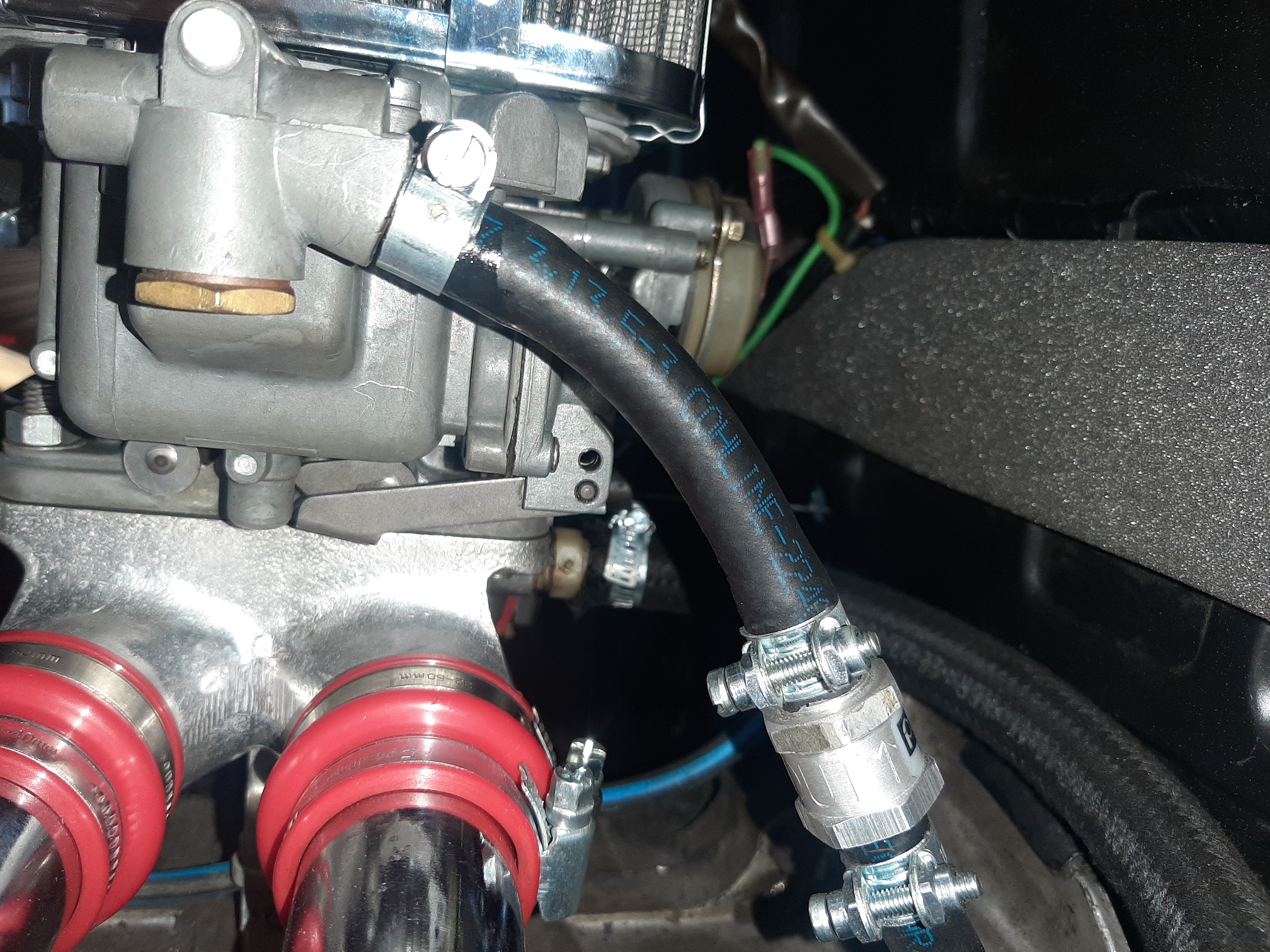 wenn ich das richtig deute ist der Gewebeummantelte Schlauch auf der Rückseite deines Vergasers der Unterdruckanschluss für den BKV. Aber warum steckt da ein T-Stück drauf? Es sieht auf einem Bild so aus, als würde ein Teil in dem Stirnblech bei Zylinder 1 verschwinden und ein Teil irgendwo nach re...