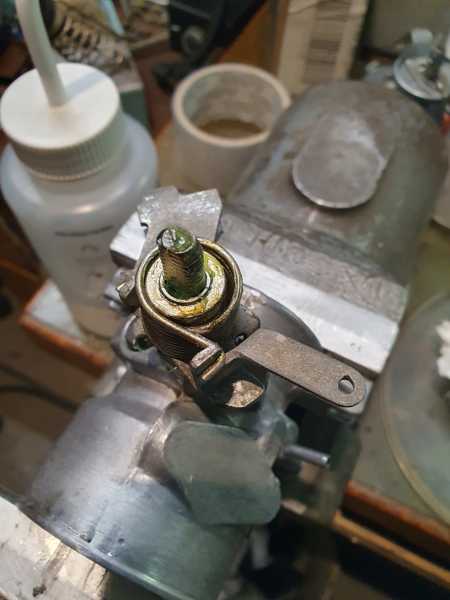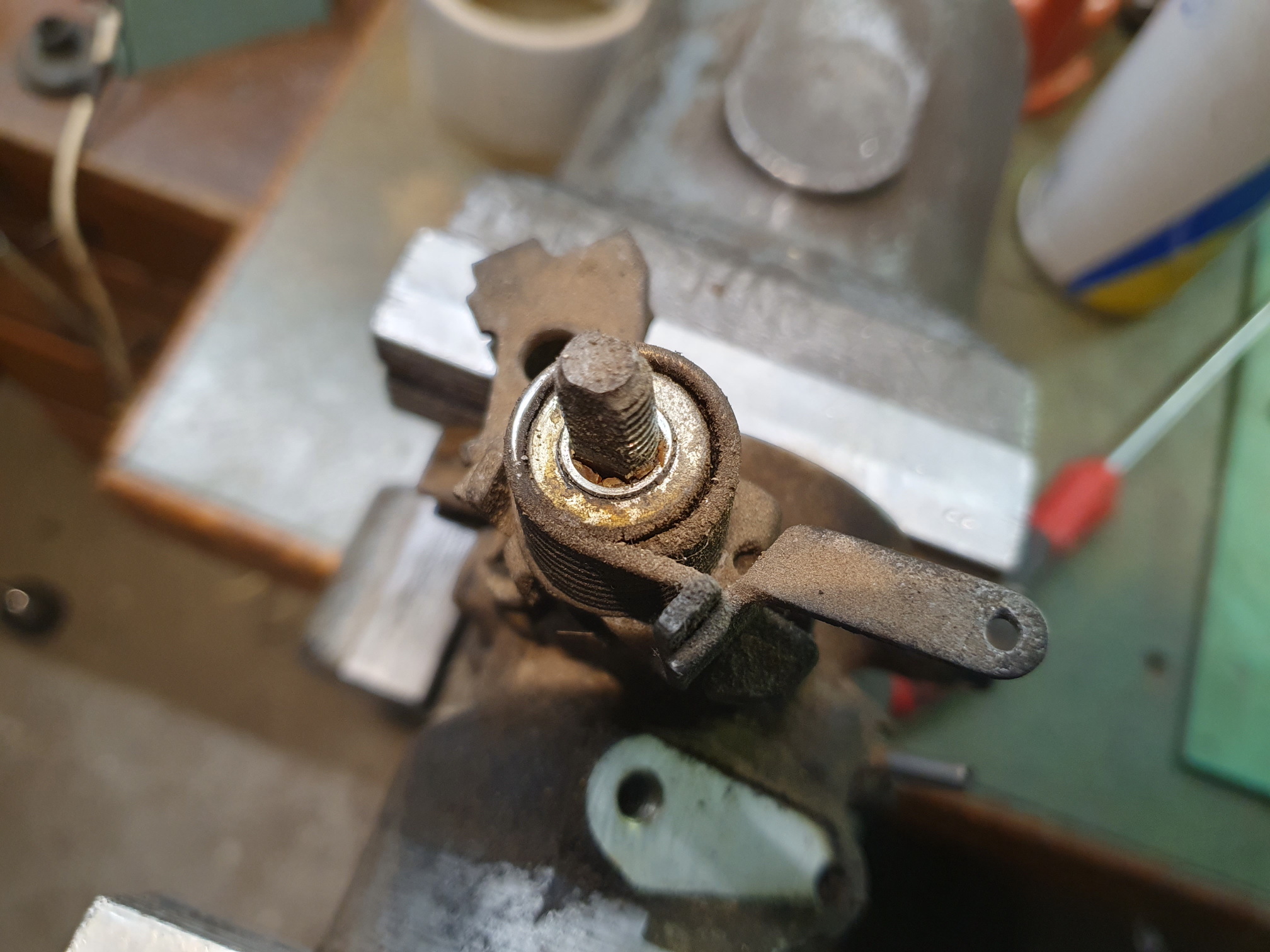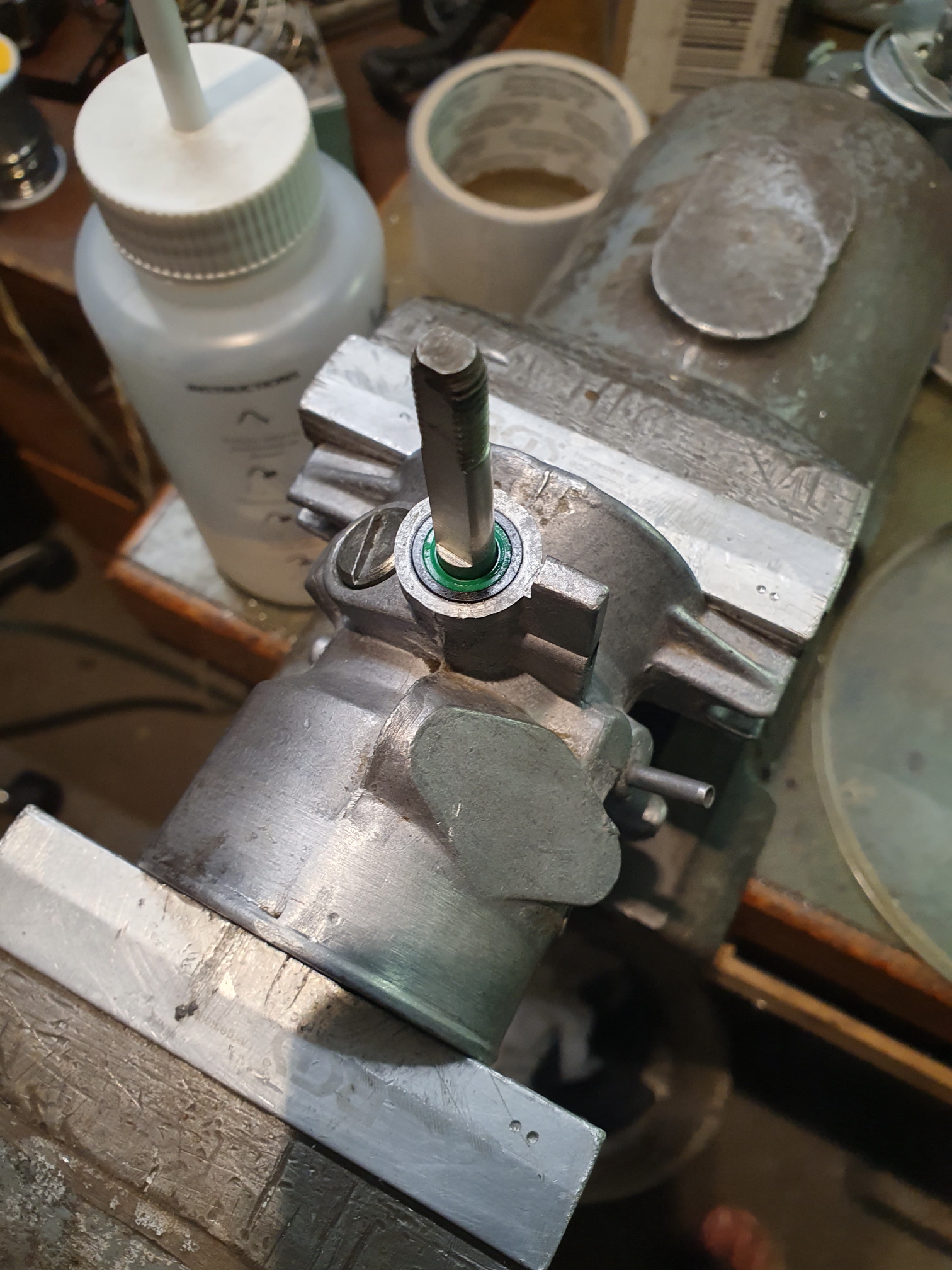 Dann die Öffnung schon mal mit Fett füllen und den Deckel wieder rein Drücken. Nun kommt die Einstellbare Stütze da dran. Damit kann man dann Später den unteren Anschlag für die Drosselklappe einstellen.