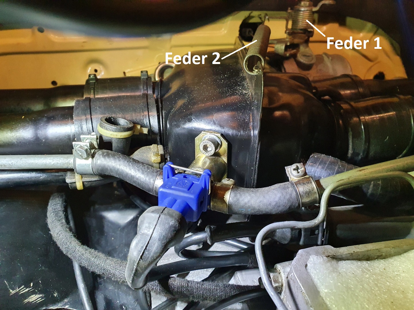 Den Halter mit der Gegenfeder abnehmen. Die Feder die hier eingehakt wird ist nicht dazu da die Drosselklappe zu schließen, sondern um die Zugkräfte vom Gaszug zu neutralisieren.