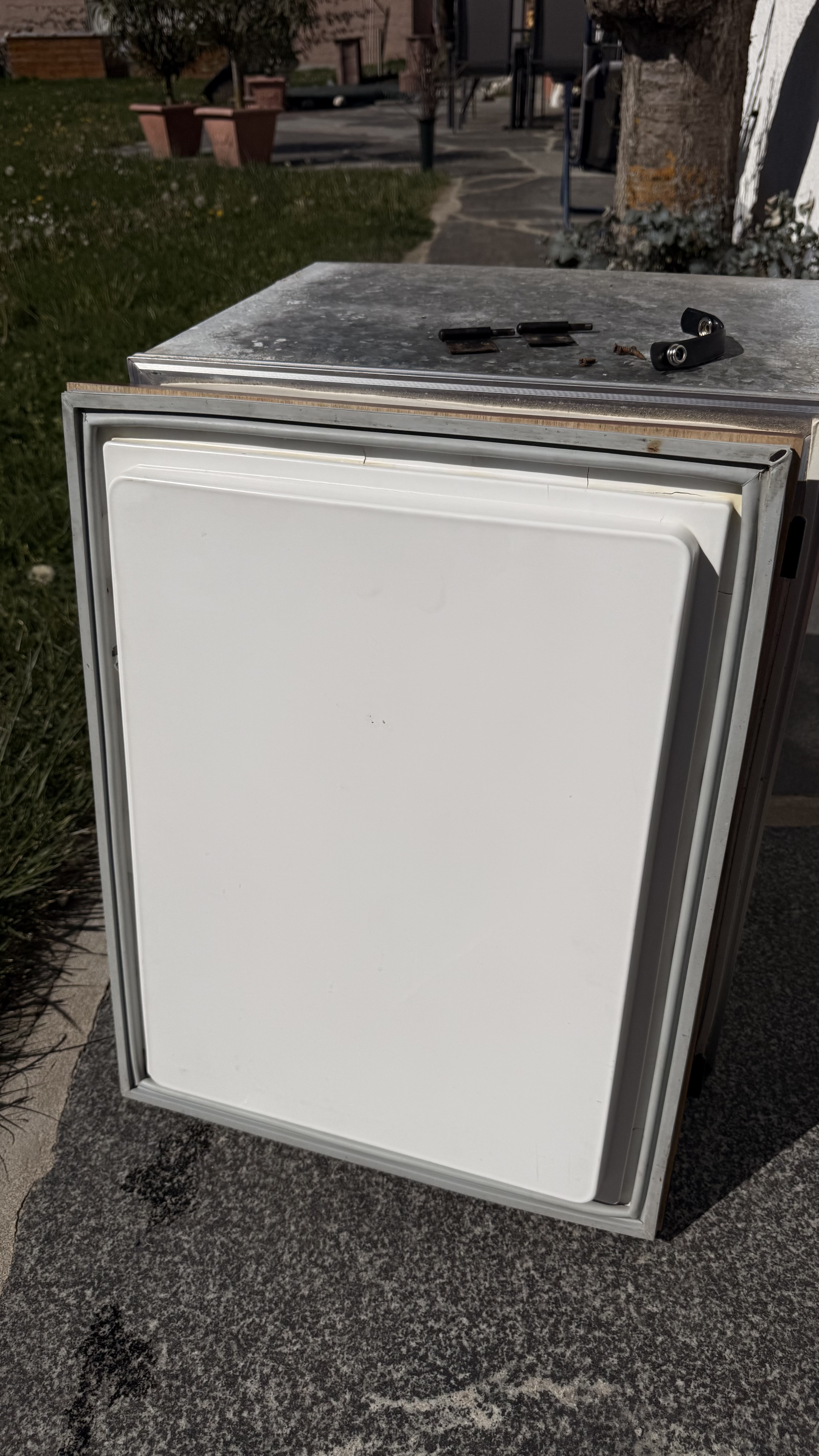 Ich biete einen originalen Westfalia Kühlschrank - Absorberkühlschrank. Er funktioniert und ist aus einem T2b Westfalia mit Baujahr 1974.