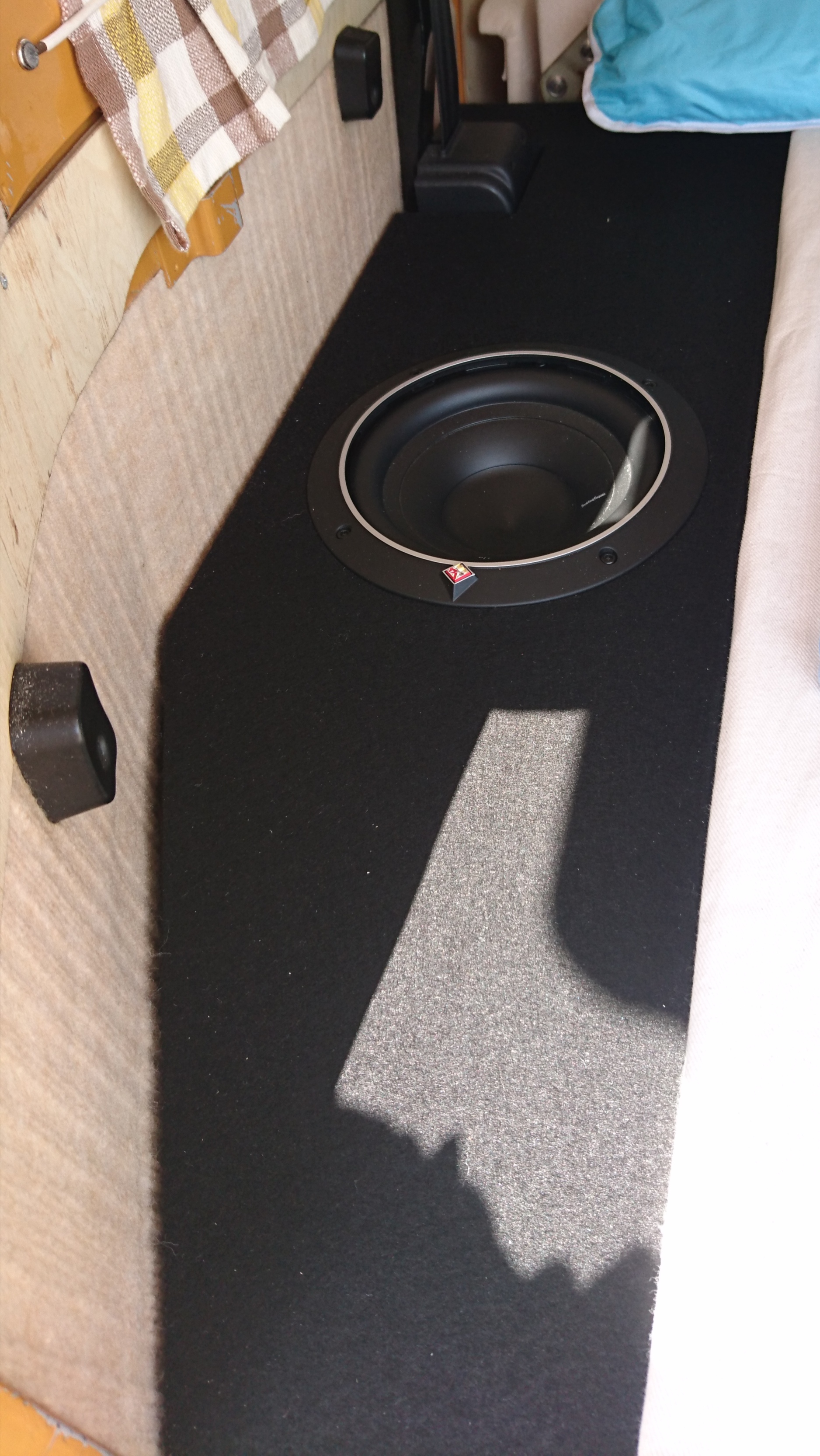 Der "kleine" Sub macht tatsächlich genug Fundament im Bus. Hat ja auch nicht so viel Volumen in der Reserveradmulde zum spielen. Das Gehäuse ist geschlossen und per Presspassung in die Reserveradmulde "gesteckt".