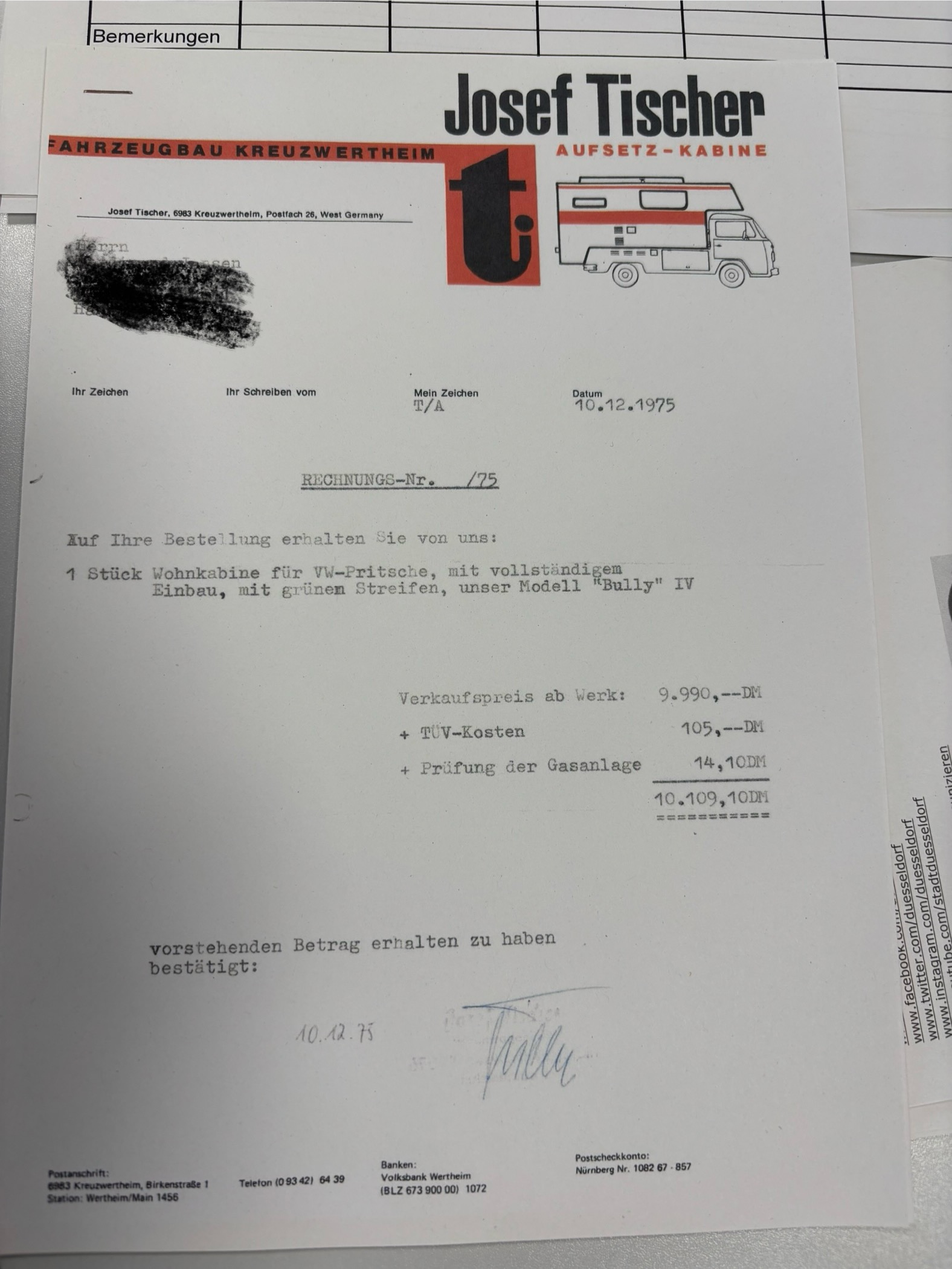 mir ist gestern eine 50 Jahre alte Marktübersicht zu Reisemobilen in die Hände gefallen. Und da taucht Deine Kabine an prominenter Stelle auf, mit genau dem Preis aus Deinem Kaufvertrag. Ein neuer Pritschenwagen hat damals auch nur 2000 DM mehr gekostet, das sind dann 22.000 DM für das ganze Gespann. Der einfachste Westfalia Helsinki war seltsamerweise um einiges billiger. Im Begleittext wird erwähnt, dass zu der Zeit ganze 12.000 Reisemobile in Deutschland zugelassen waren.