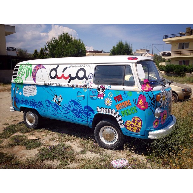 unser Bus noch in Griechenland. Echt cool. Die Schirmchen an den Scheinwerfern