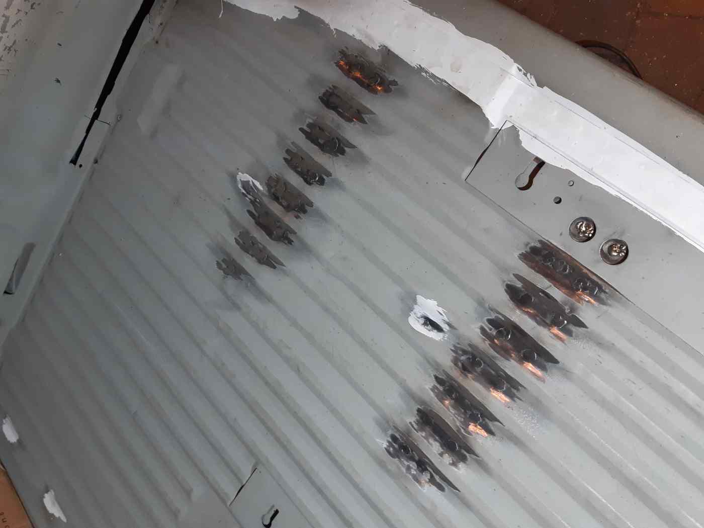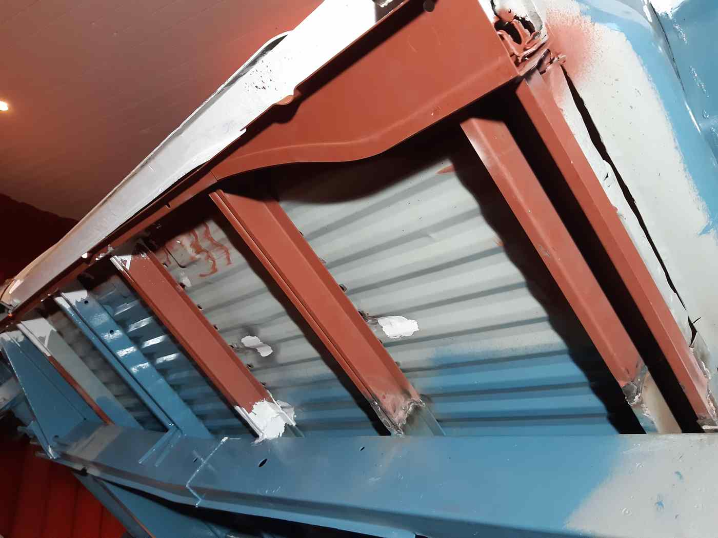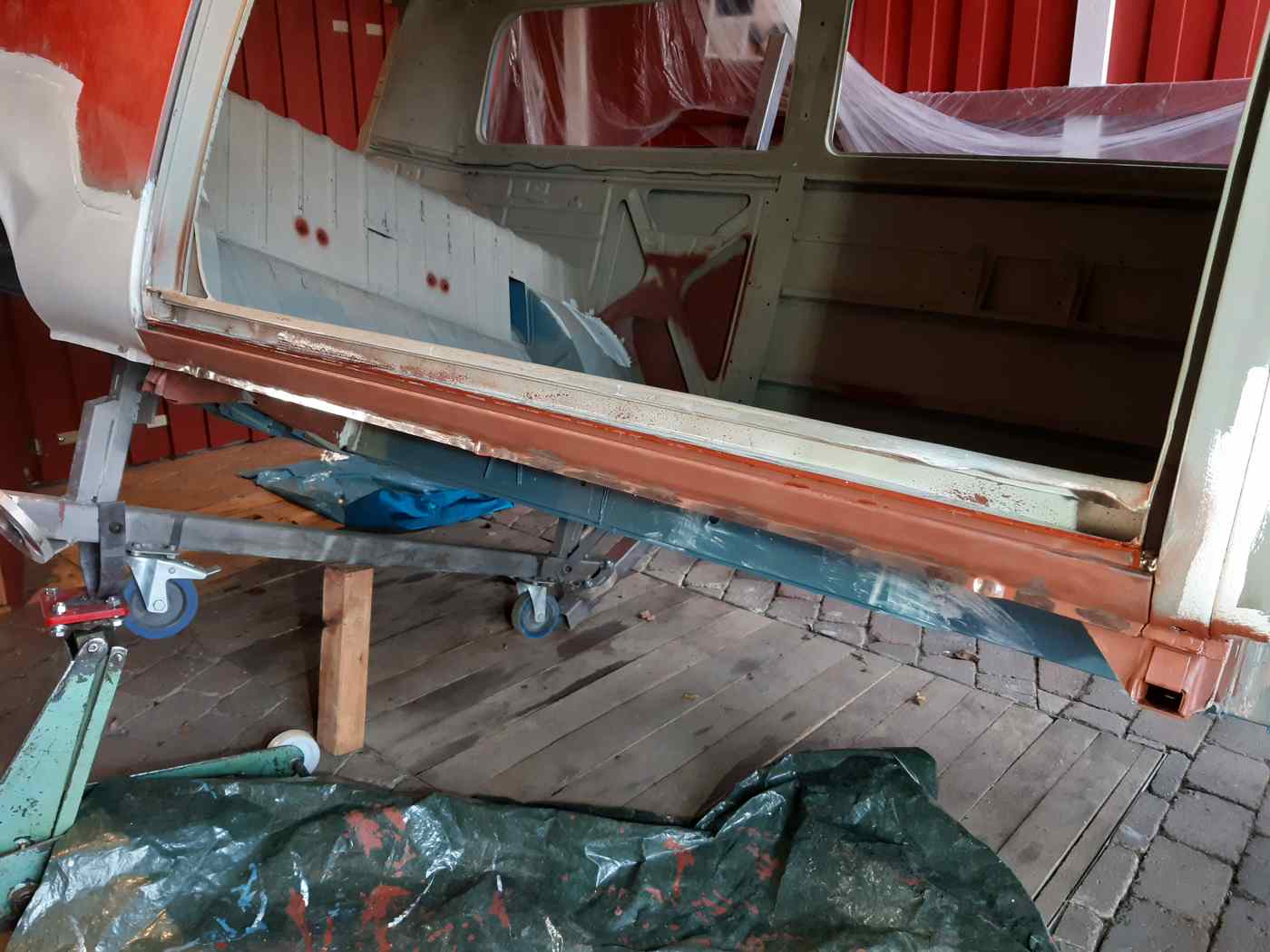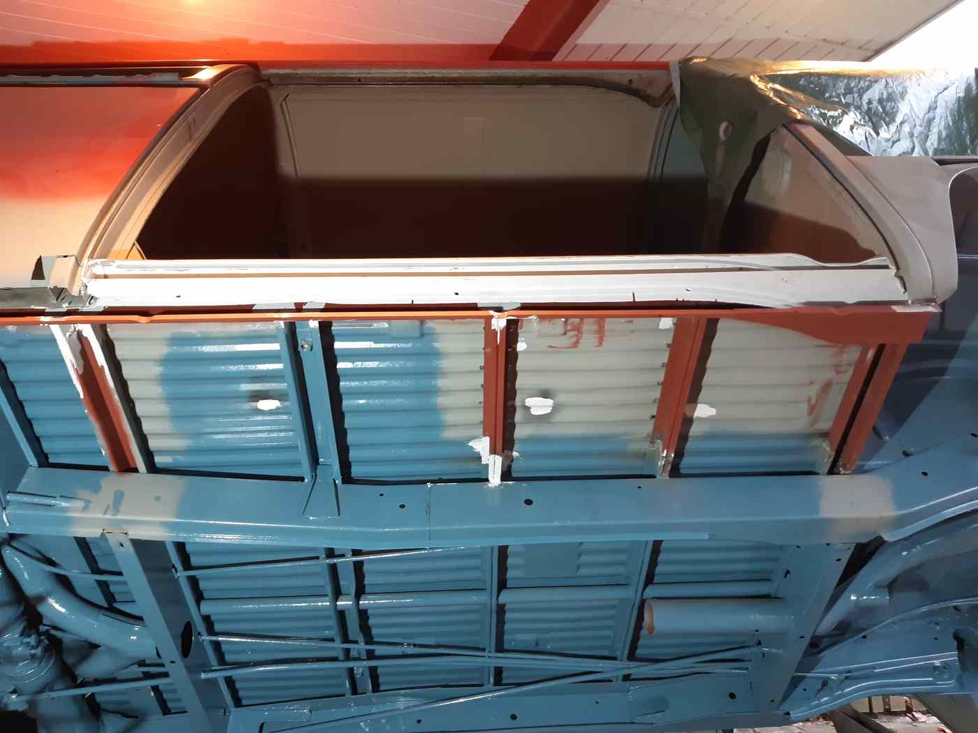 Ist momentan grundiert. Und es waren überall diese Pappen dran. Die fliegen raus. Richtiger Himmel rein. Schöne Seitenverkleidungen.
