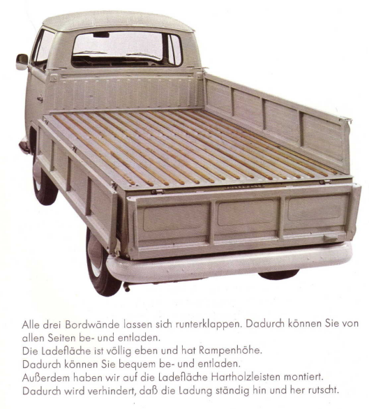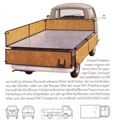 Es gab eine Großraumpritsch mit Ladewänden aus Holz: Prospekte und Preislisten finden sich auf meiner Website: https://www.vw-t2-bulli.de/de-books-bro ... orter.html