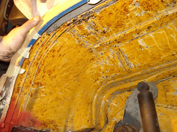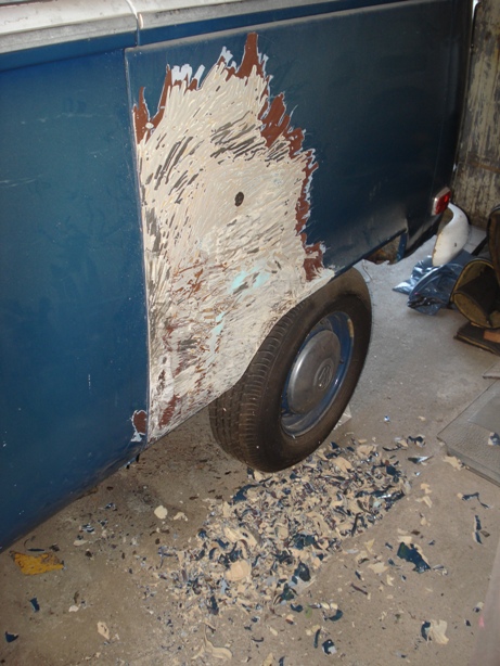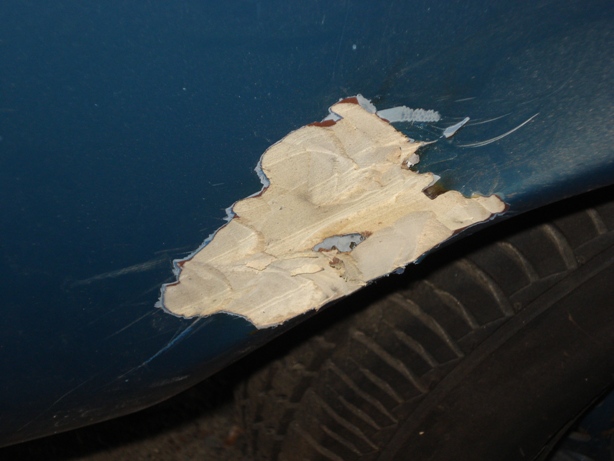 ...zeigte der Magnettest, dass beim hinteren linken Radlauf irgendwas nicht stimmen kann. Hier sieht man die ersten Schichten Spachtel, die ich entfernt habe. Das gesamte Ausmaß war mir zu diesem Zeitpunkt noch nicht bewußt.;-)