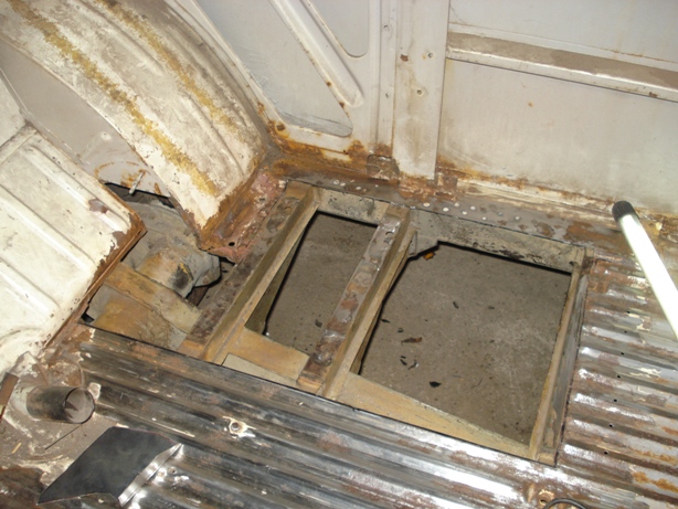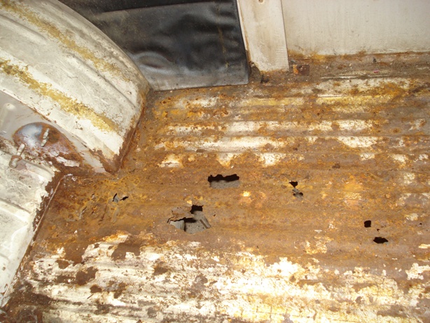 Der Laderaumboden hinten links war leider ziemlich stark vom Rost befallen, weil die Amis dort Spaxschrauben durch den Boden geschraubt haben. Das Blech mußte daher...