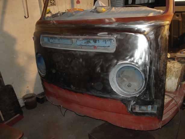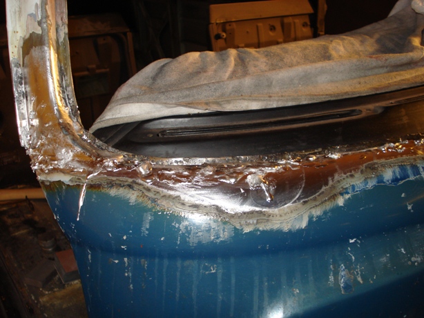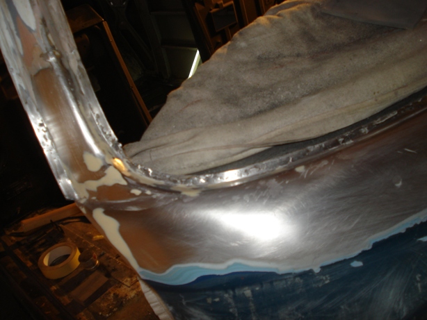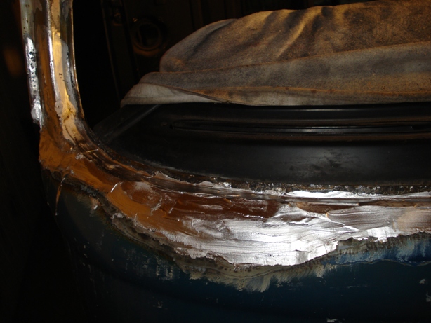 ...und es anschließend verstrichen. Da es meine erste Verzinnung war, habe ich das Zinn nicht genug verstrichen, so dass ich anschließend eine menge Nacharbeit hatte, denn die Karosseriefeile war natürlich zu sperrig, um in die Ecken des Scheibenrahmens zu gelangen, so dass diese Stellen mühsam geschliffen werden mußten (das zeug ist hart!).