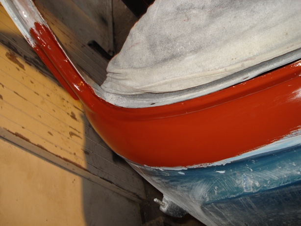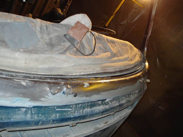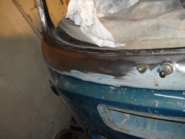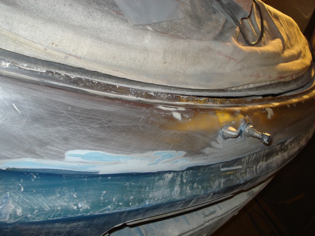 Die Hälfte des hinteren Seitenteils war, aufgrund eines Seitenaufpralls im vorderen Teil des Radlaufs, großflächig neu modelliert worden. Auffällig ist dabei, dass die Amis scheinbar ganz gerne auch dort Spachtelmasse aufgetragen haben, wo es gar nicht nötig gewesen wäre, was zu unglaublich dicken Spachtelschichten führt, wie man auf dem nächsten Bild...