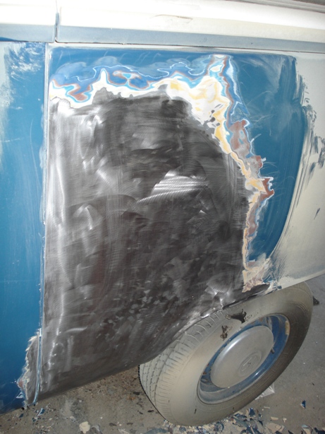 Heute wird weiter entlackt und dann werde ich die Tage wohl versuchen, den Radlauf wieder einigermaßen in Form zu bringen und zu verzinnen, damit künftig nur noch dort Spachtel benötigt wird, wo es wirklich nötig ist.