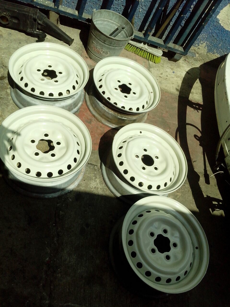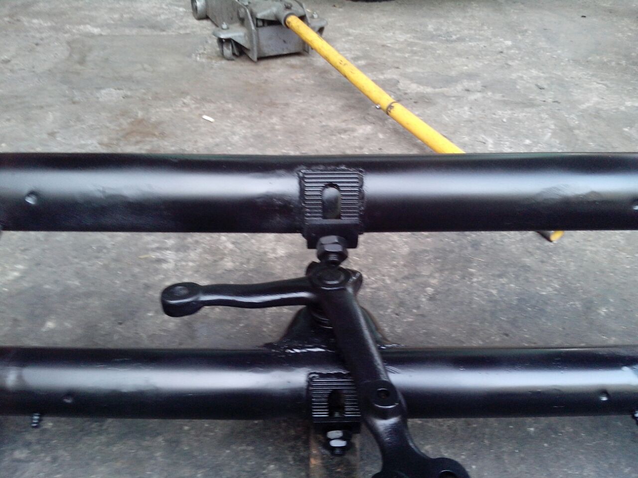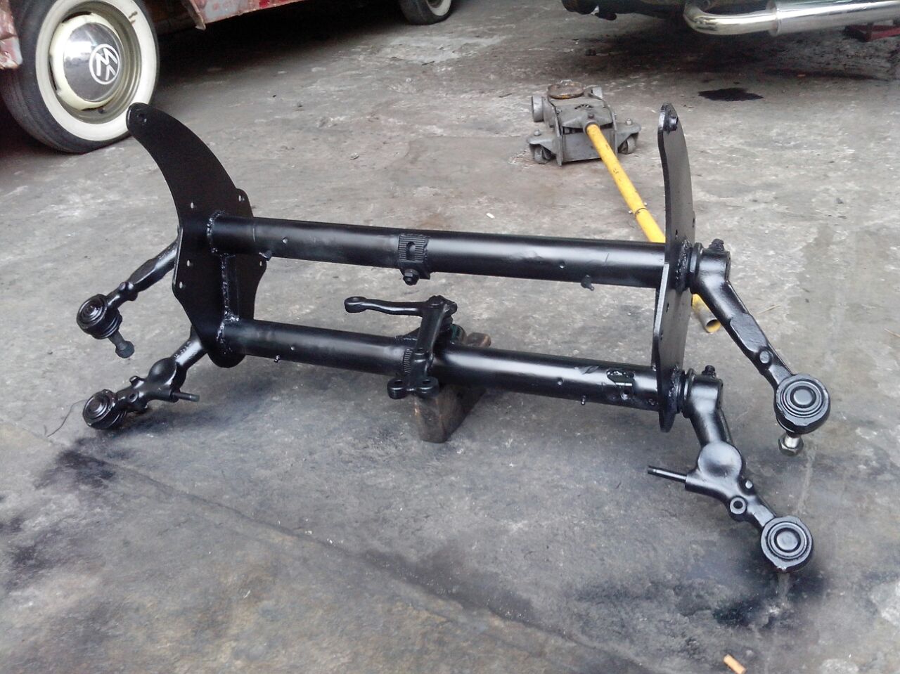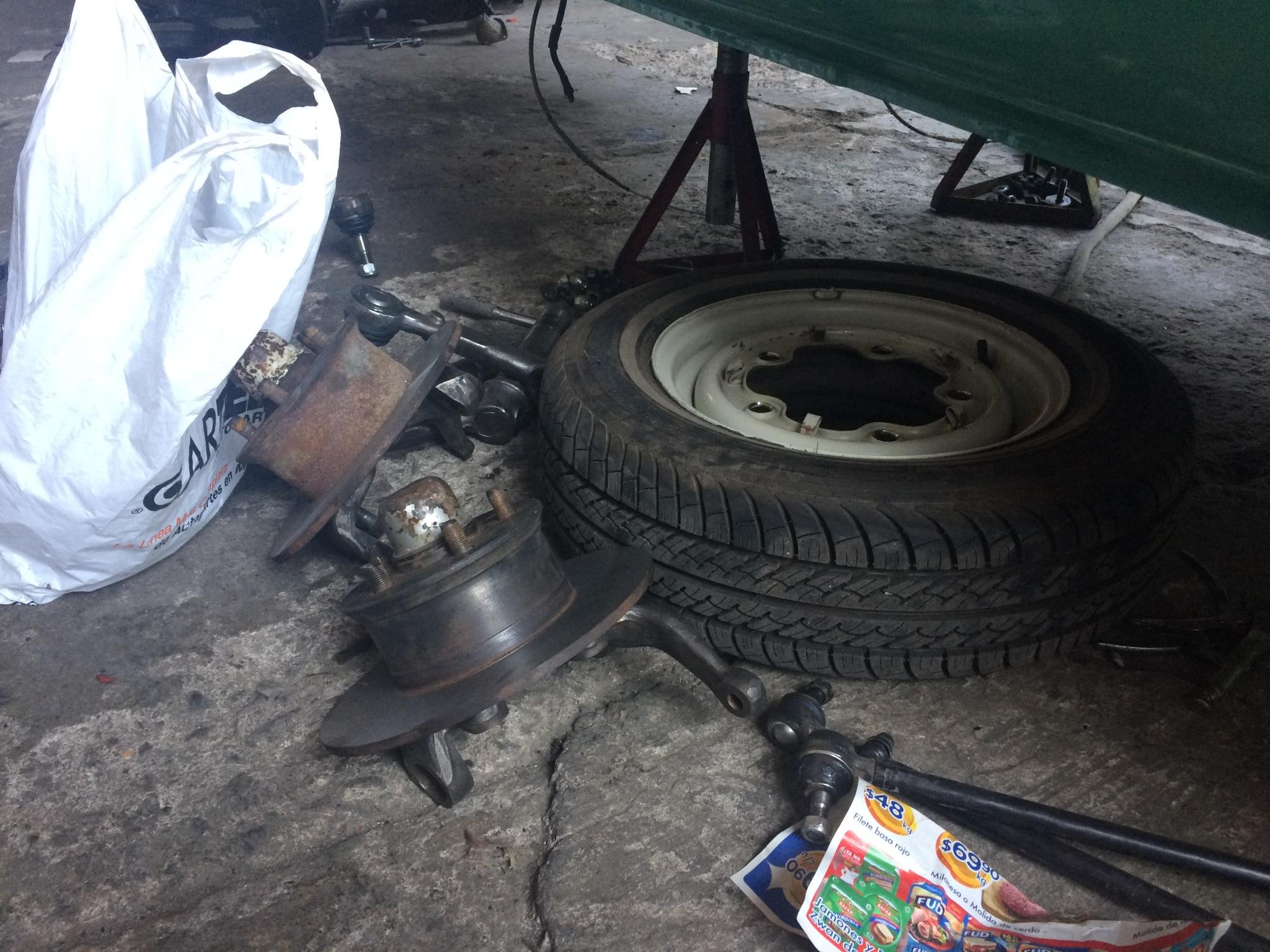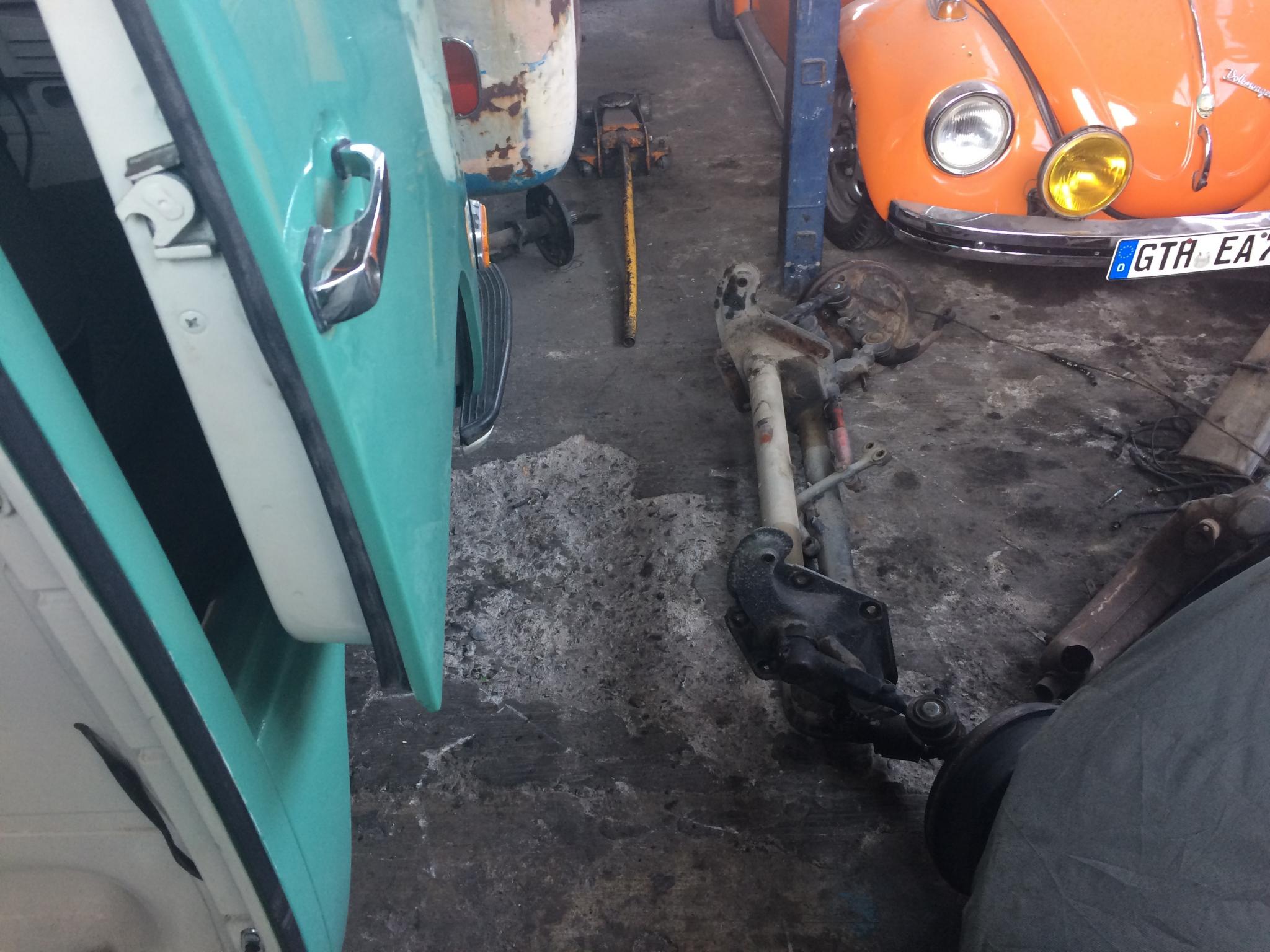 Die T2b-Achse ist in Optimierung durch Einkürzen und Austausch sämtlicher Verschleißteile. Scheibenbremse überholt, Bremstrommeln für hinten überholt. Neu gelackte 14" Felgen sind schon da. Er gibt sich noch den morgigen Tag um das alles fertig zu kriegen, denn Montag wartet schon der Autosattler. :-O