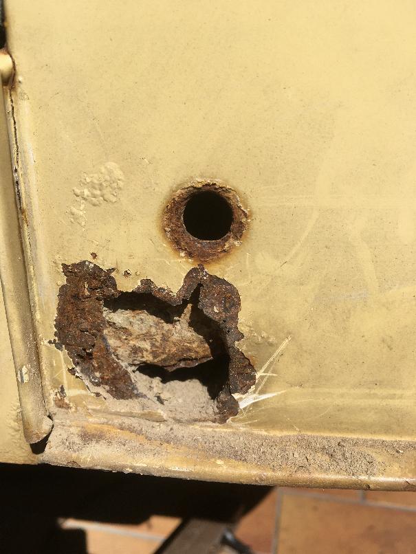 Hatte letztes Wochenende ml an einer kleinen Rostblase im Lack an dem Hohlraumversiegelungsstopfen hinten gekratzt. Leider löste sich mit dem Lack auch das Metall - oder besser ehemaliges Metall Nach dem Heraustrennen kam das nächste verrostete Blech dicht darunter zum Vorschein: Wurde auch entfernt ... Da drunter sieht es zwar nicht top aus, aber zumindest auch nicht (offensichtlich) durchgerostet. Da dahinter weitere angerostete Bleche sind stellt sich die Frage: Was tun?