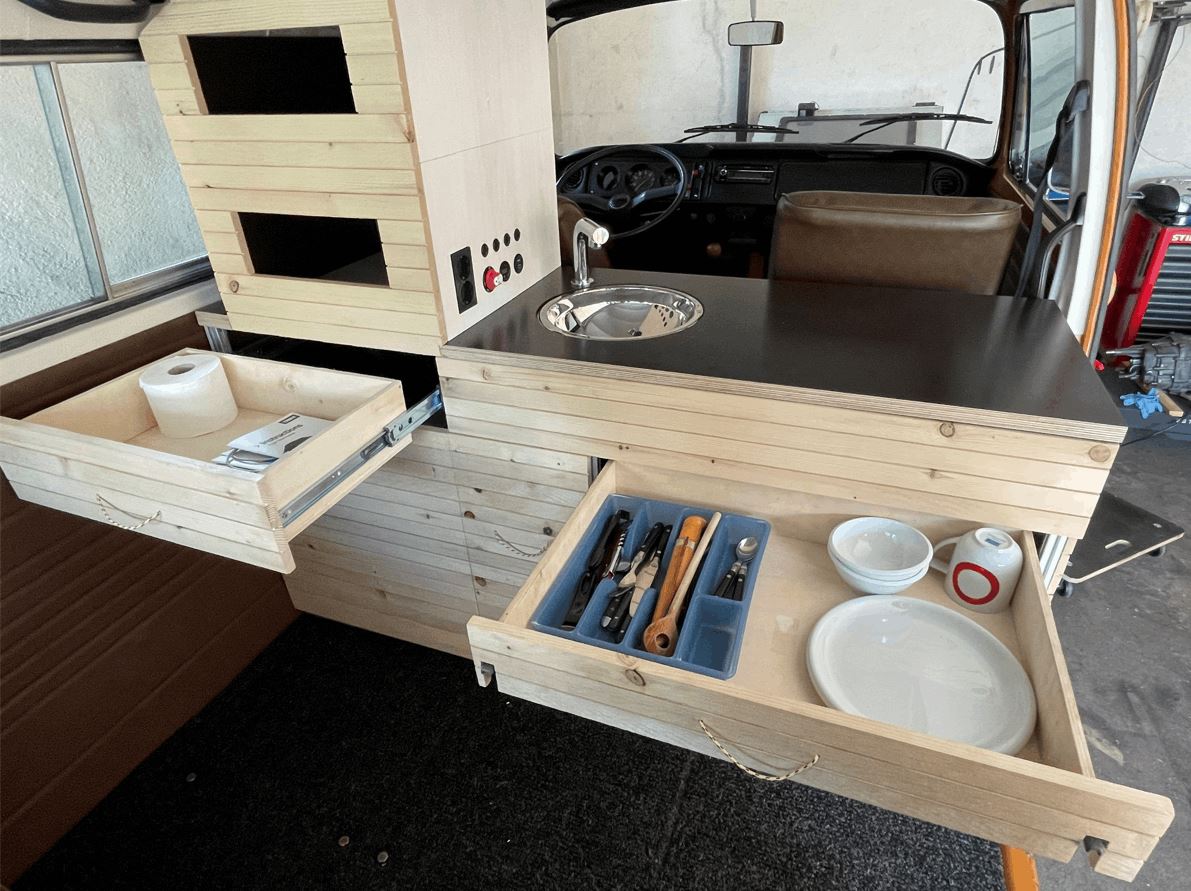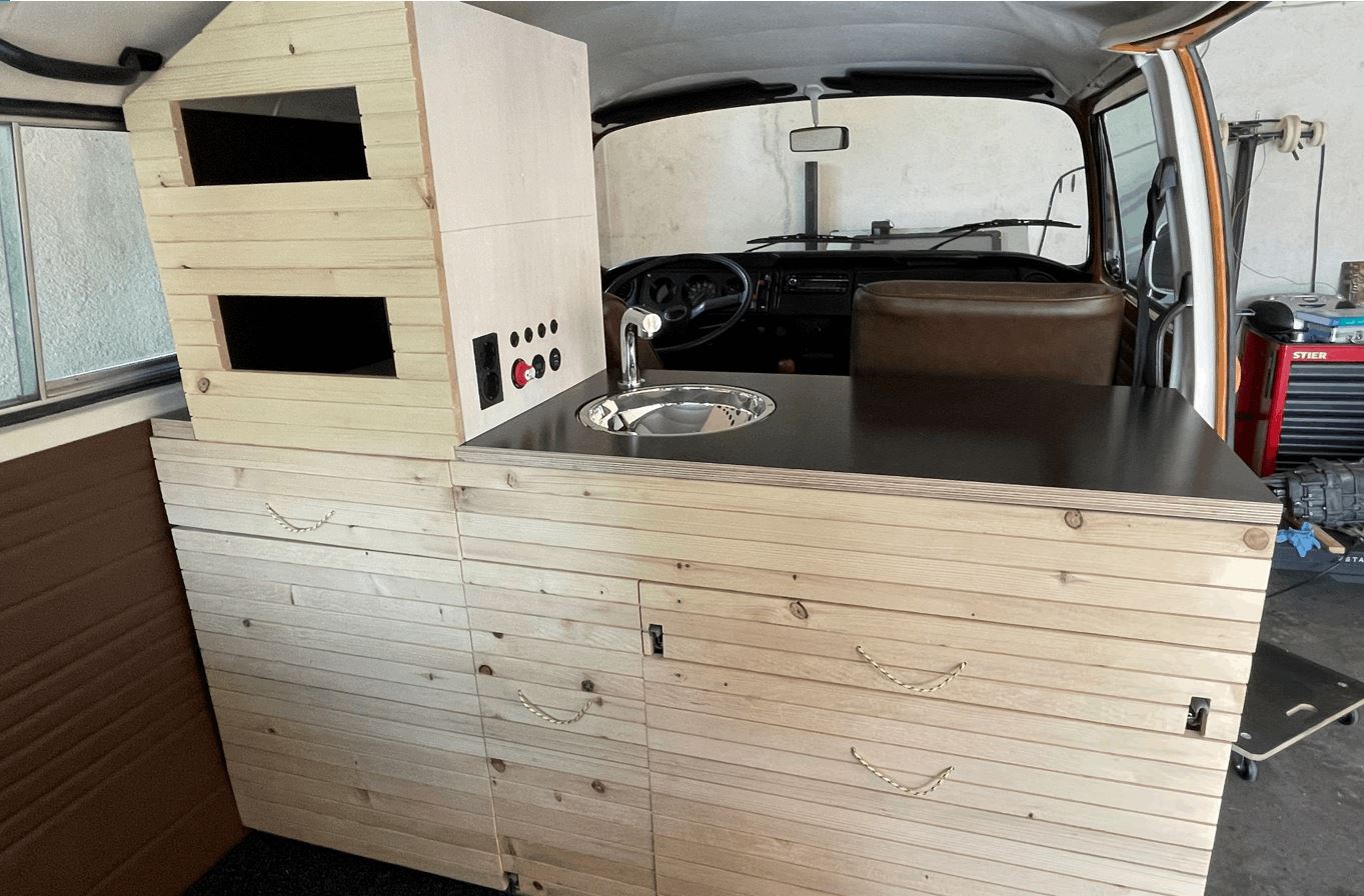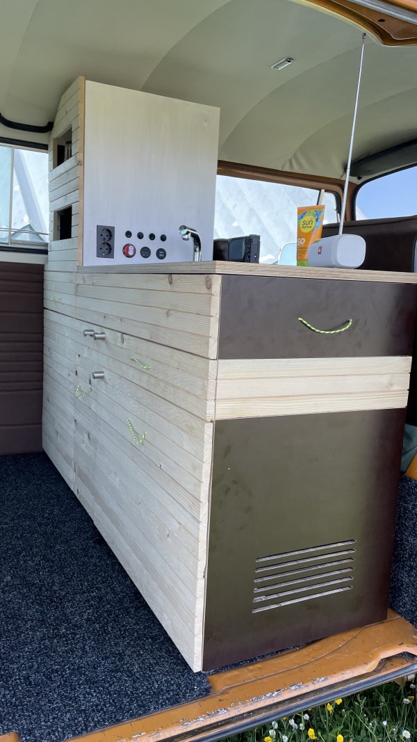 Die Ausstattung hat sich während des Baus auch noch einmal etwas erweitert und enthält neben dem Kochfeld nun auch Wasser/Abwasser, Kompressorkühlbox, Zusatzbatterie, Wechselrichter mit Ladegerät und Solarladeregler. Bilder von allem folgen sobald ich mit den neuen Auszügen durch bin.