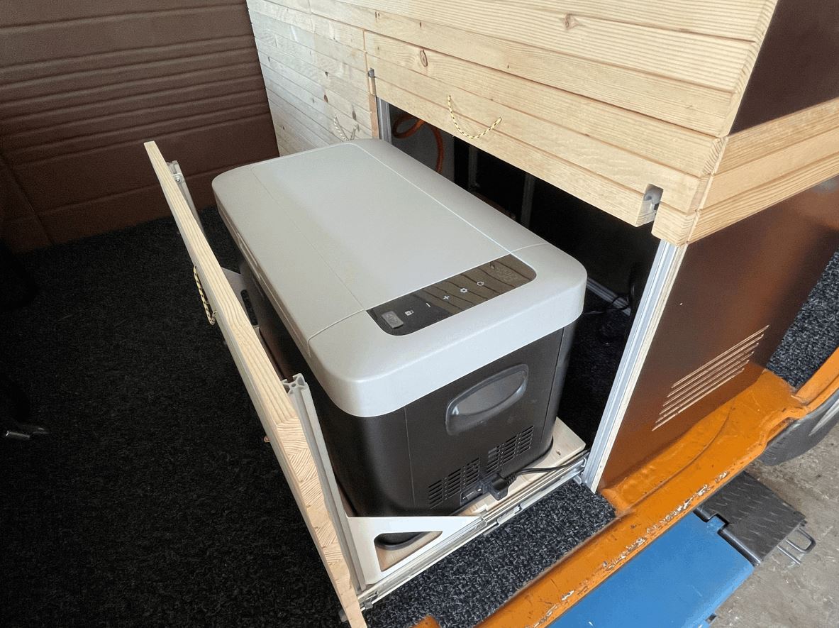 Bei der Kompressor-Kühlbox habe ich mich aus Platzgründen für eine 35l Variante entschieden. Platz ist da drin genug, schade ist nur, das normale Wasserflaschen nicht aufrecht hineinpassen. Auch musste ich wegen der Kühlbox die Einteilung der Schubfächer noch einmal anpassen, da die laut Hersteller 58cm breite Box neben noch den Stecker hat und damit nicht in den 60cm breiten Auszug passen wollte. Auch die Tragegriffe scheinen wohl für die Breite nicht wichtig gewesen zu sein