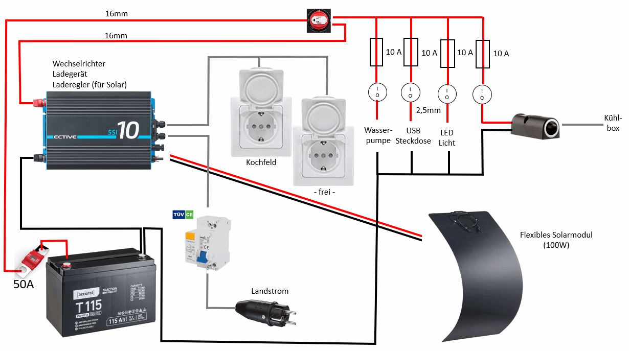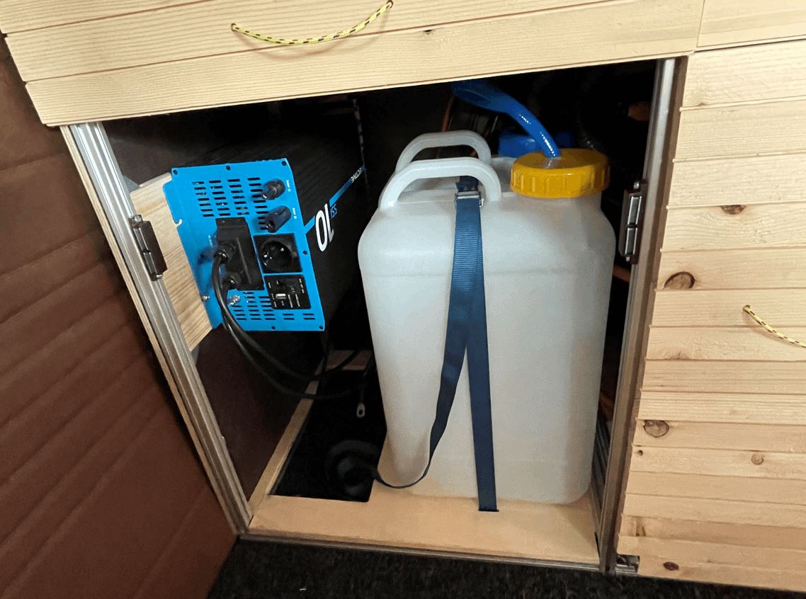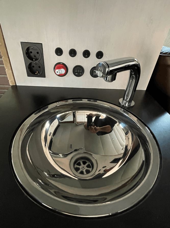Wasser und Abwasser sind jeweils Kanister mit 19l. Da mir die normalen Camping Amaturen nicht gefallen haben, habe ich anstelle einer Tauchpumpe eine Druckpumpe eingebaut, damit lässt sich dann ein ganz normaler Wasserhahn verwenden. Mit der Druckpumpe ist es dann auch einfach und bereits geplant, einen Abzweig für eine Außendusche an der Seite anzubringen, die man dann einfach durch das Schiebefenster von draußen erreichen kann. Auf dem Bild sieht man auch die Steckdosen, den Hauptschalter und Schalter für Kühlbox, Wasserpumpe, Voltanzeige & USB Steckdose sowie Licht in den Ablagefächern (das fehlt derzeit auch noch).