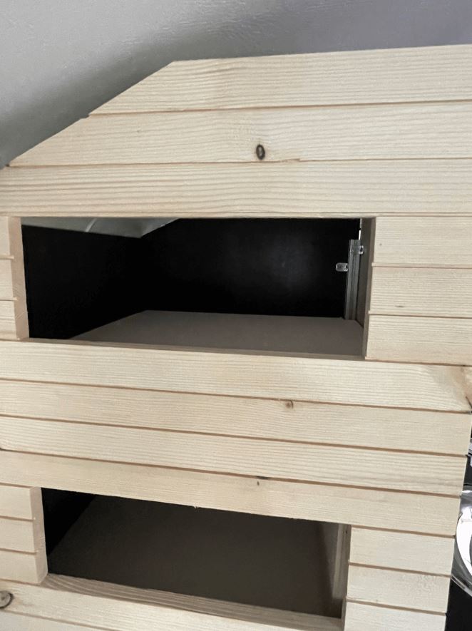 Für die Holzfront habe ich Dachlatten verleimt, bei denen die eine Ecke weggefräst wurde. Sieht man hier ganz gut auf dem Bild.