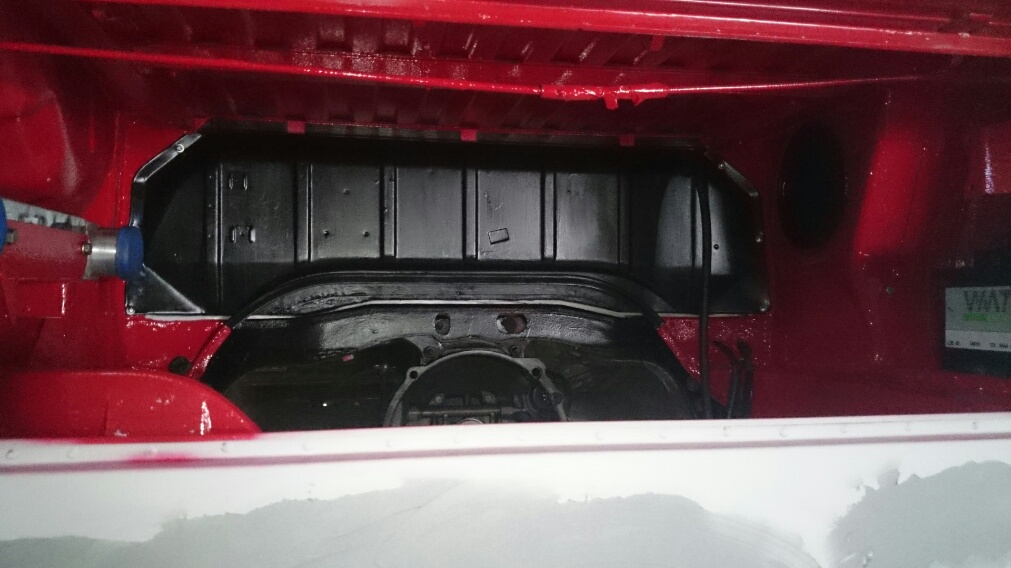 Motor wieder draußen, Motorraum grundiert .