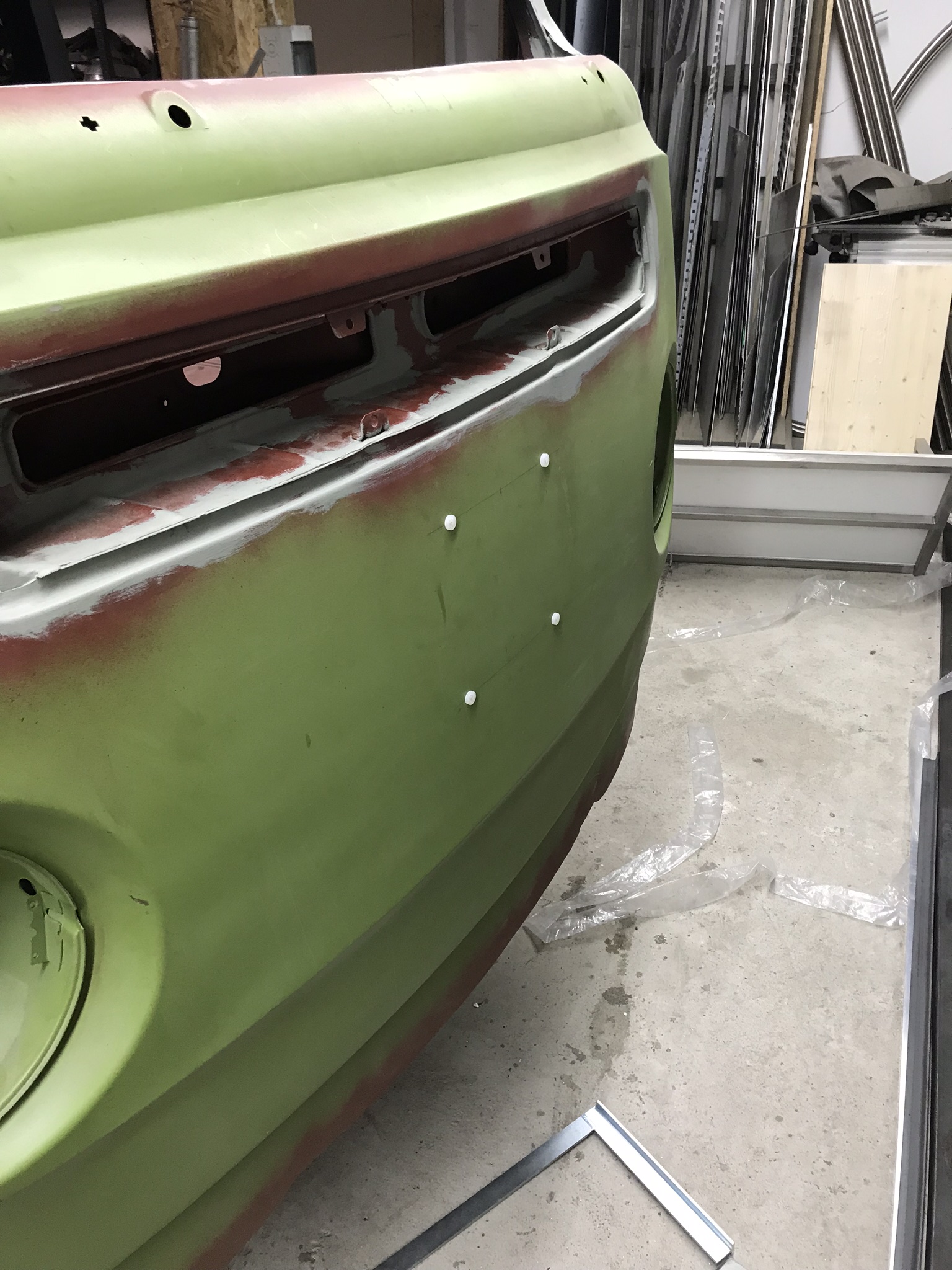 An der neuen Front habe ich noch die notwendigen Anpassungen vorgenommen, wie z.B. Löcher fürs VW Emblem und die Antenne gebohrt sowie probeweise die Windschutzscheibe eingebaut.