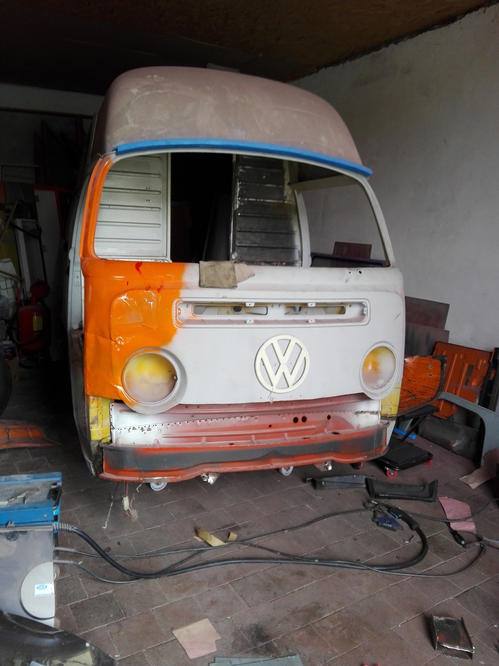 Viel passiert ist offensichtlich nicht. Grund dafür sind 3 (teils) restaurierte Düdos, ein Alltags-Mercedes-S210, der zustandstechnisch dem T2 sehr ähnelte und unzählige weitere Instandhaltungsarbeiten an jeder Menge Autos. Noch dazu wohne ich mittlerweile 275km entfernt vom Bus im Schwabaländle. Ihr merkt schon, keine Top-Voraussetzungen für eine Vollrestaurierung in diesem Ausmaße... Noch dazu habe ich wohl nicht recht aufgepasst, was mein Bulli in meiner Abwesenheit so treibt...