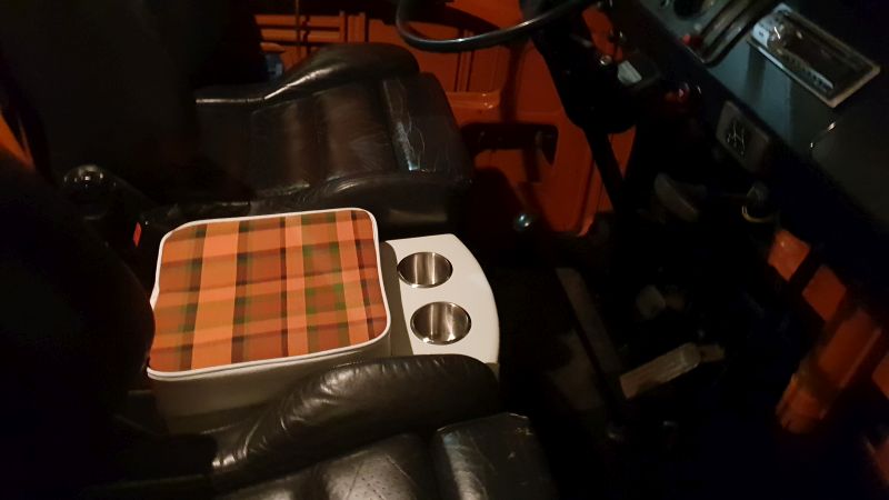 Dann habe ich einen Getränkehalter inkl. Staufach im Zwischenraum der Vordersitze gebaut.