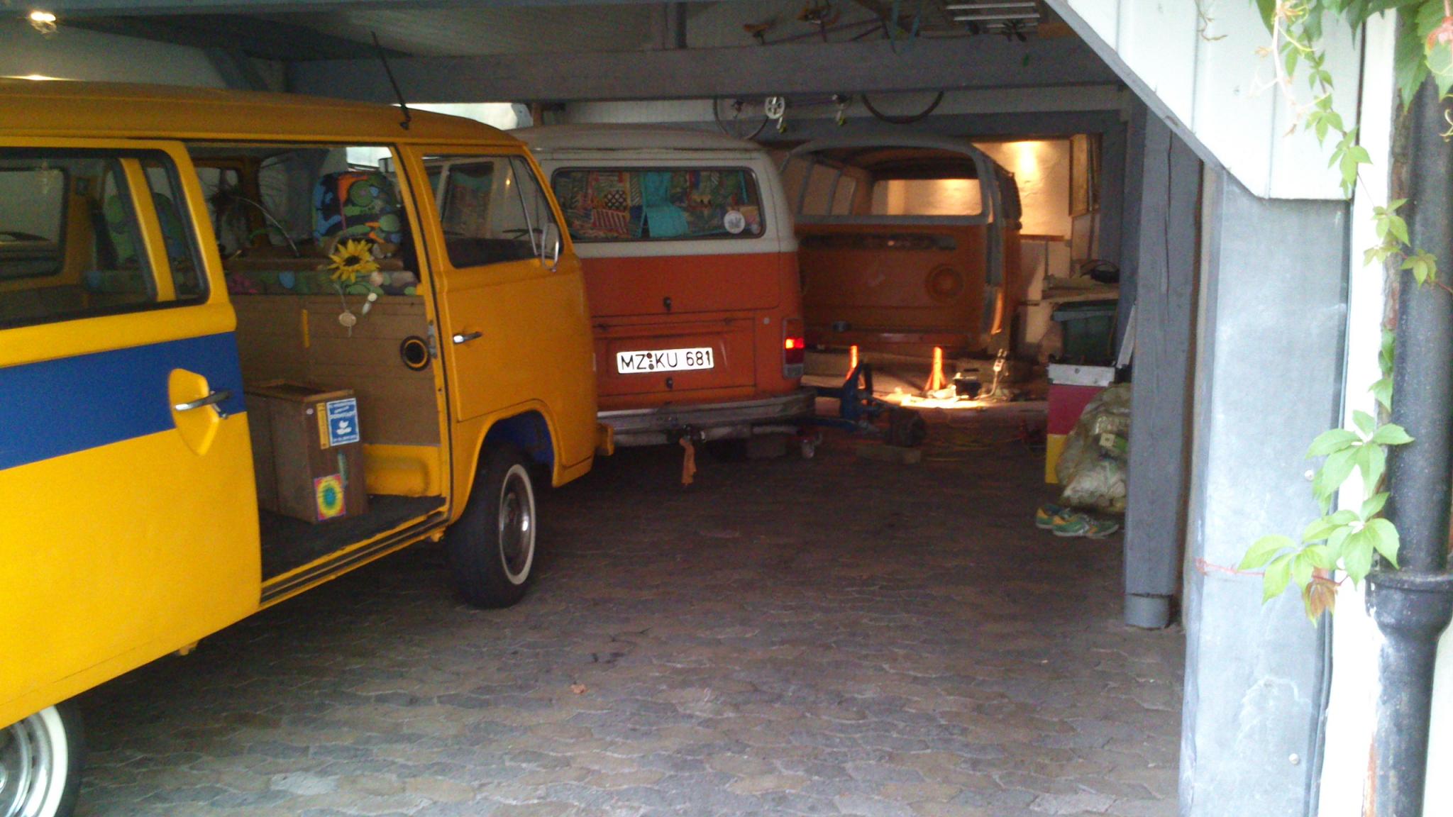 Dude hat geschrieben:Dude hat geschrieben:Der Bus hat außen einige Schweißarbeiten, unternrum sieht er aber nicht schlecht aus. Verträgt sich nicht so richtig mit der Vorstellung, dass er seit 2000 auf einer Wiese stand und untenrum noch überall Gräser rumhängen aber was solls. Der Motor ist ein 2 Liter und ist nach neuem Sprit und neuer Batterie auch recht zügig angesprungen. Auf dem Tacho stehen 140.000km. Die Westfaliaausstattung ist glaube ich vollständig, sogar ein Keilkissen ist im Innenraum rumgeflogen. Die Bremsen waren leider fest weil die Handbremse seit August angezogen war, konnten wir aber mithilfe von einem Passat mit Anhängerkupplung und Abschleppseil lösen.