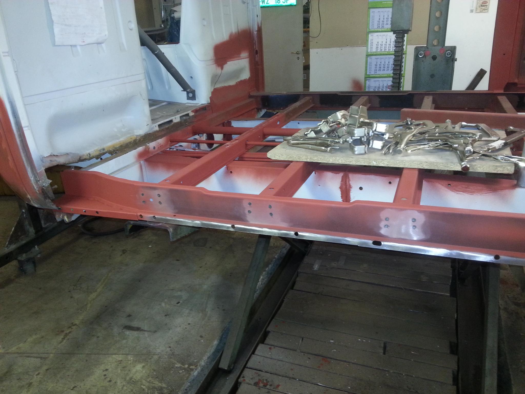 Heute habe ich die Querträger, den linken Längsträger und Unterbodenrohre bzw Röhrchen entrostet/entlackt und anschließend grundiert.