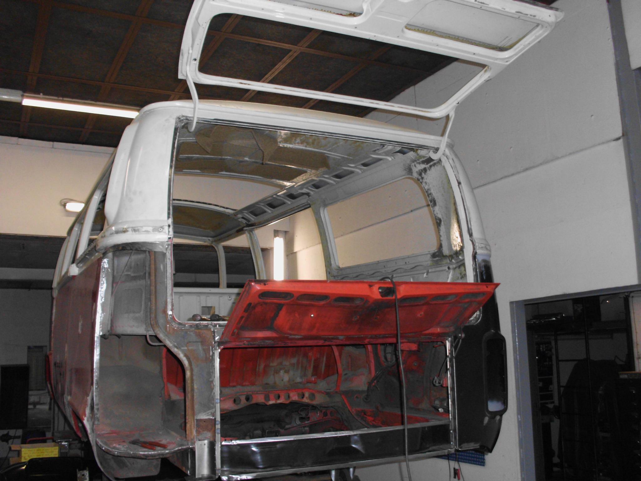 ich habe ein paar Photos vom Ursprungszustand angehängt, kann ja nur besser werden. Der Clipper L - 9 Sitzer wurde im Oktober 1972 mit der Zweifarbenlackierung kasanrot/pastellweiß und alabasterfarbenen Sitzen ausgeliefert. Er hat das große Schiebedach und als Extras Heizungsausströmer im Fahrgastraum und Bremskraftverstärker. Er wird (hoffentlich bald wieder) von seinem Originalmotor 1,7 l / 66 PS Flachmotor angetrieben. Bis dahin sind offenkundlich noch ein paar "Kleinigkeiten" zu erledigen. Einstiegsbleche, Ecken hinten beidseits, Abschlußträger, Bodenblech Fahrgastraum, Windschutzscheibenrahmen... wurden bereits ersetzt. Eine Beifahrertür, Heckklappe und Stoßstangen suche ich noch. Der Unterboden war bereits Trockeneis gestrahlt und bot keine unangenehmen Überraschungen, mal sehen was die Lackiervorarbeiten noch so zu Tage bringen.