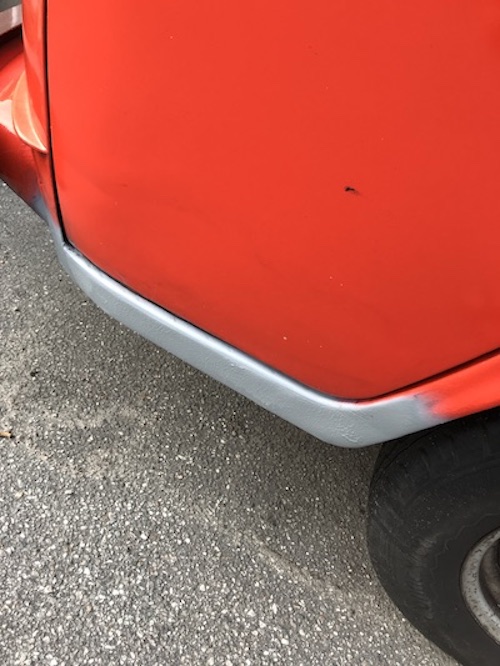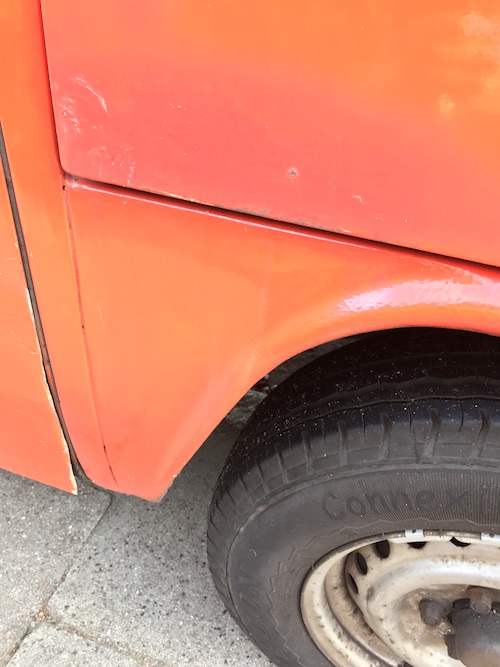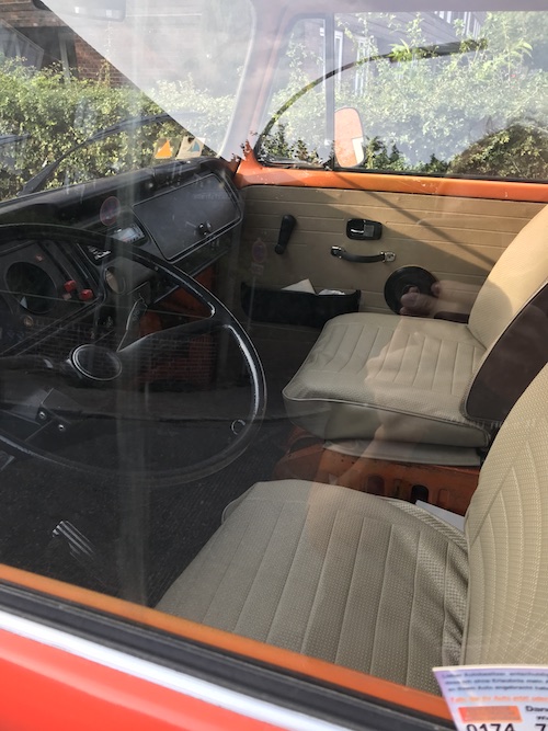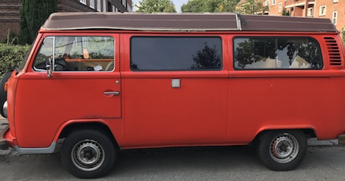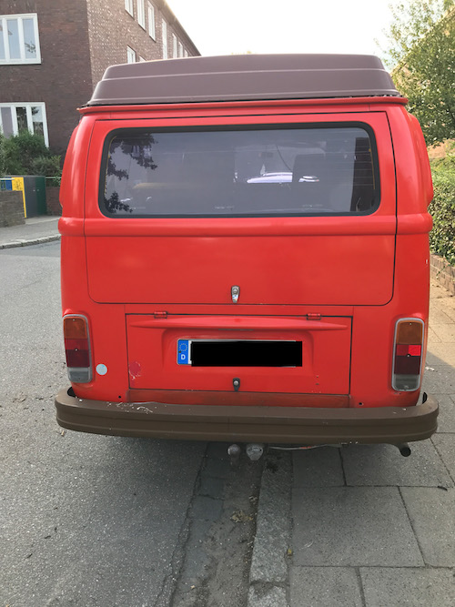 Was ich bereits weiß: T2, 1973, mit Westfalia-Ausstattung (sieht nach Helsinki aus – Bezüge braun/nicht kariert), rot (Ich schätze, dass der früher mal orange war, 1,7 Motor, Benziner, hat gerade TÜV bekommen, unfallfrei, kein H-Kennzeichen, Aufstelldach (muss erneuert werden, Ersatz ist aber schon vorhanden), keine Durchrostung, Anhängerkupplung, Fahrradanhänger, neues Schiebefenster hinten. Wurde gerade gemacht: neue Bremsklötze erneuert, neue Scheinwerfer, neue Zündkerzen- und Kontakte , Vergaser gereinigt, Motor+ Getriebe gereinigt, Vorderachse und Radlager eingestellt, Vorderachse komplett erneuert, Auspuffanlage erneuert