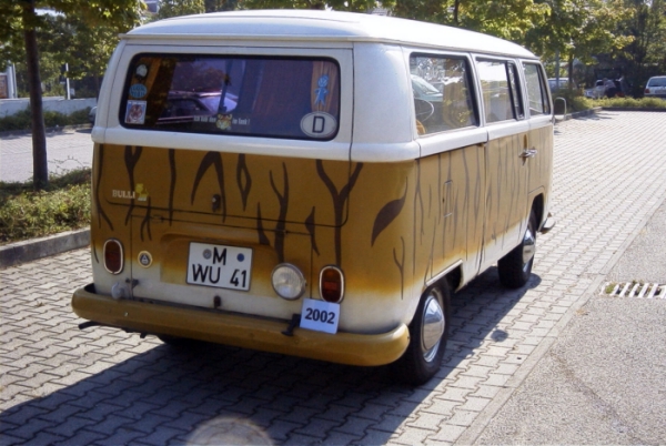 In München fuhren zu der Zeit relativ viele "Hippieautos", einige sogar im Zebralook! Diese Revoluzer! Irgendwie waren die mir aber zu schwarz-weiss. Gefährlicher war da natürlich ein Tiger. (Wenn ich gewußt hätte, dass ich dadurch 23 Jahre später mal bei der Erteilung der 07er Nummer massiven Ärger bekommen würde ... hätte ich noch Klarlack darüber lackiert ;-) So wurde Bulli zum "Streifenwagen", Nachbarkinder sprechen auch respektvoll hinter vorgehaltener Hand vom Tigerentenbus.