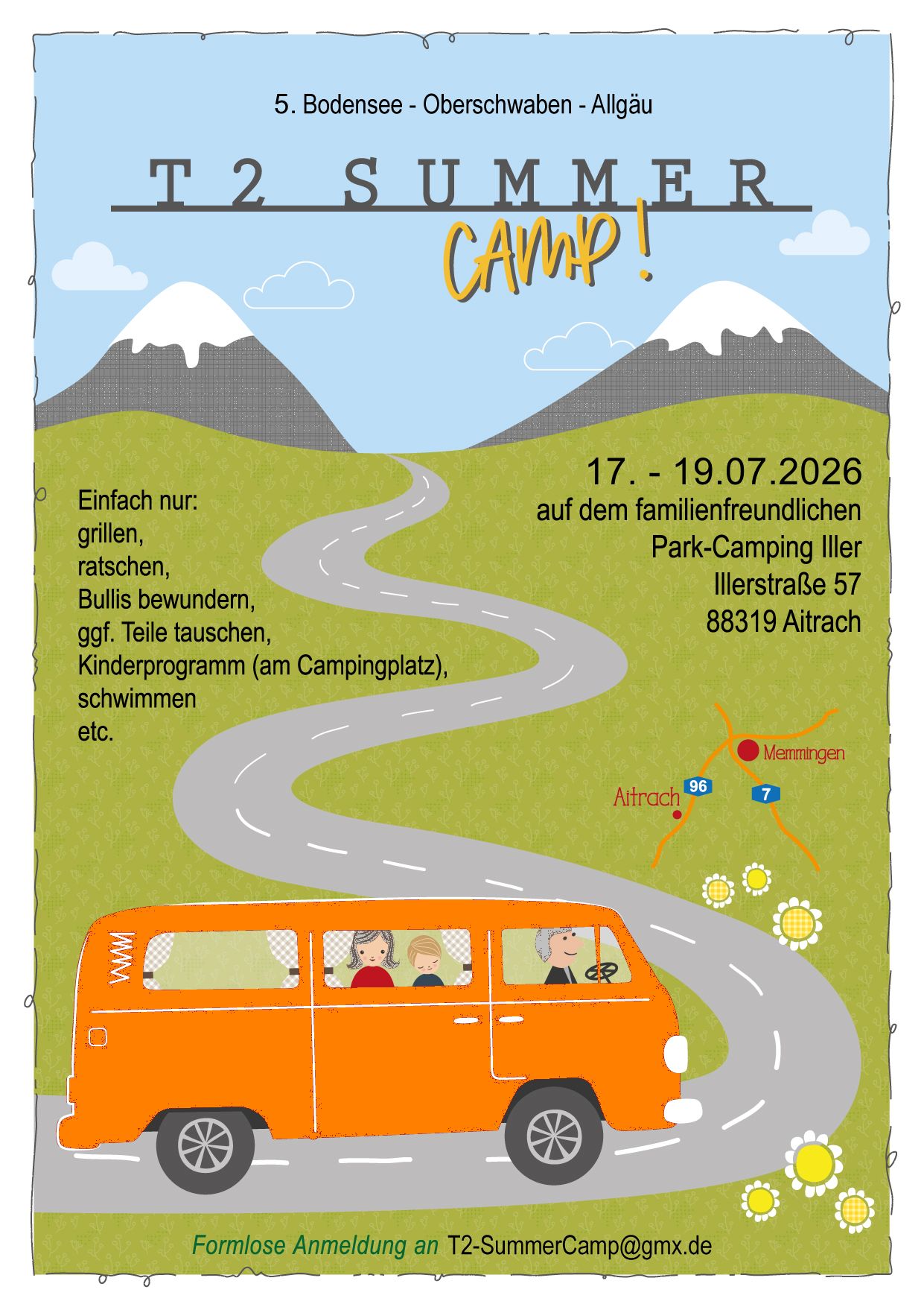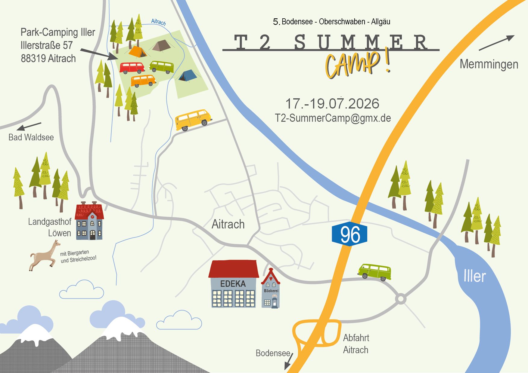 Wie seit dem ersten "T2-SummerCamp 2016" und den weiteren "2. T2-SummerCamp 2018", "3. T2-SummerCamp 2022" sowie "4. T2-SummerCamp 2024" treffen wir uns wieder auf dem familienfreundlichen Campingplatz Iller-Camping in Aitrach (https://www.camping-iller.de), wo ausreichend Plätze auf der Sonnenwiese für unsere T2 reserviert sind.