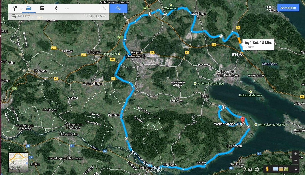 Startpunkt hat ja Harald perfekt dar gestellt. Also direckt Abfahrt Radolfzell nehmen, dann links unter der Brücke/Autobahn durch nach Radolfzell und dann gleich wieder links.