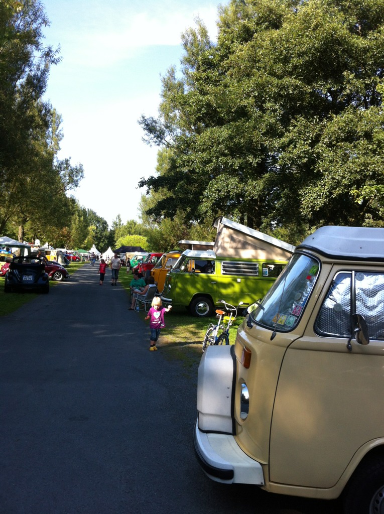 Hier ist sehr genial. Rasen als Stellplatz, ne Menge Käfer und auch Bullis. Offenbar begeisterte Besucher und einfach fröhliche Teilnehmer. Wir halten noch ein wenig Platz frei.