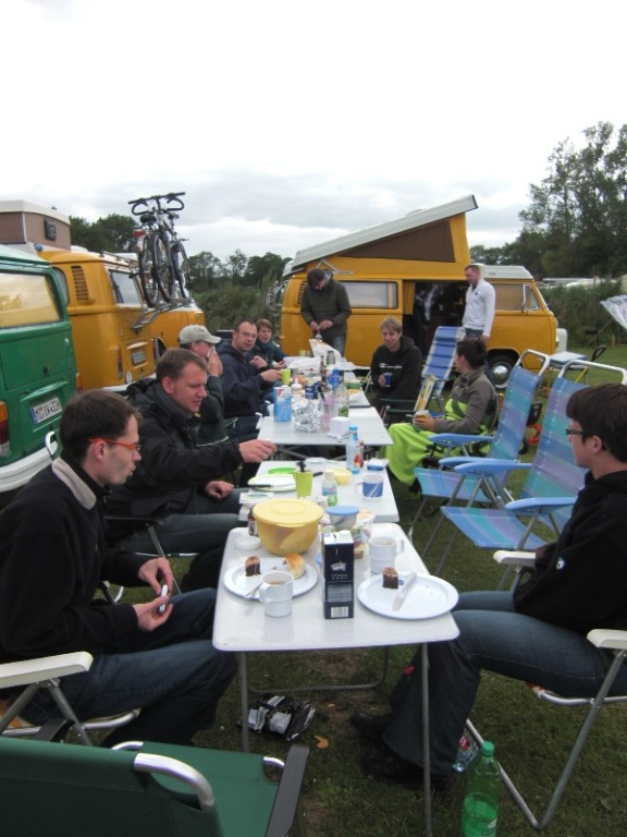 Wir standen zwar nur 400 m von Eurer Bulli-Gang entfernt aber man hat so viele Verpflichtungen das der Besuch etwas kurz ausgefallen ist.Mal liegt Dirk vollkonzentriert unter seinem Bulli,beim nächsten mal am Sonntagnachmittag war der Platz beinahe verwaist.Hätte mir gerne noch des Berliners Berlin angesehe,wegen der Tür vor der Heizungsluke. Klappt bestimmt bei einem der nächsten Treffen