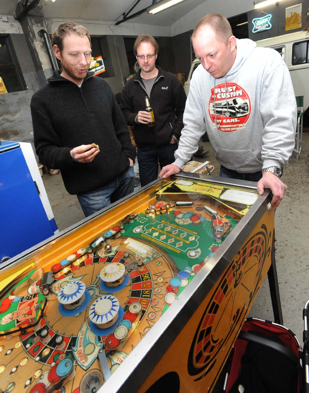Es war ein gelungener Abend im Oberbergischen! Hat Spaß gemacht Robins Bulli zu bestaunen, das Buffet zu plündern ( hier vor allem Danke an Andi, Utah und Stefan), den Flipper zu quälen, mit Euch ein bis drei Bierchen zu trinken und zu quatschen! Gringo, ich bin echt neidisch auf Deine Halle :thumb: