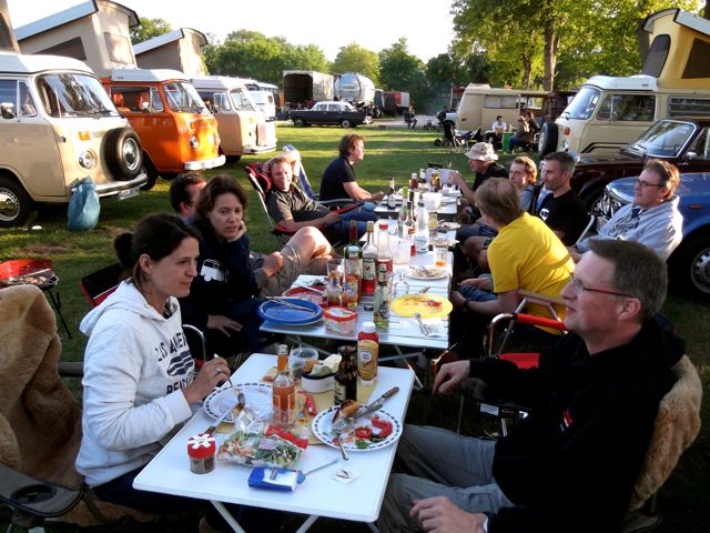 Die Leute. Richtig nette Truppe. Jörn und Corinna ohne Heuschnupfen, Mario, Silke und Elin in Urlaubslaune, Fichel unter Damen- und Hundeüberwachung, Ludwig mit Lust und Buch und Nachbarin aus Bremen, deren Name ich immer wieder vergesse, Thomas mit T1 endlich mal wieder, Guido noch endlicher mal wieder und mit Meike (?), Thomas ohne Tanja ganz angetan, die Alfa-Schätzchens und der Cousin mit Frogeye, René und der gar nicht mehr unkende Seargent. Toll. Besser geht einfach nur, wenn der gesamte Vorstand der IG T2 erscheint ;-)
