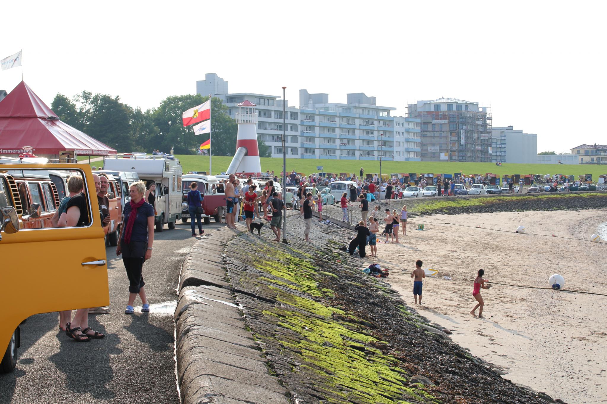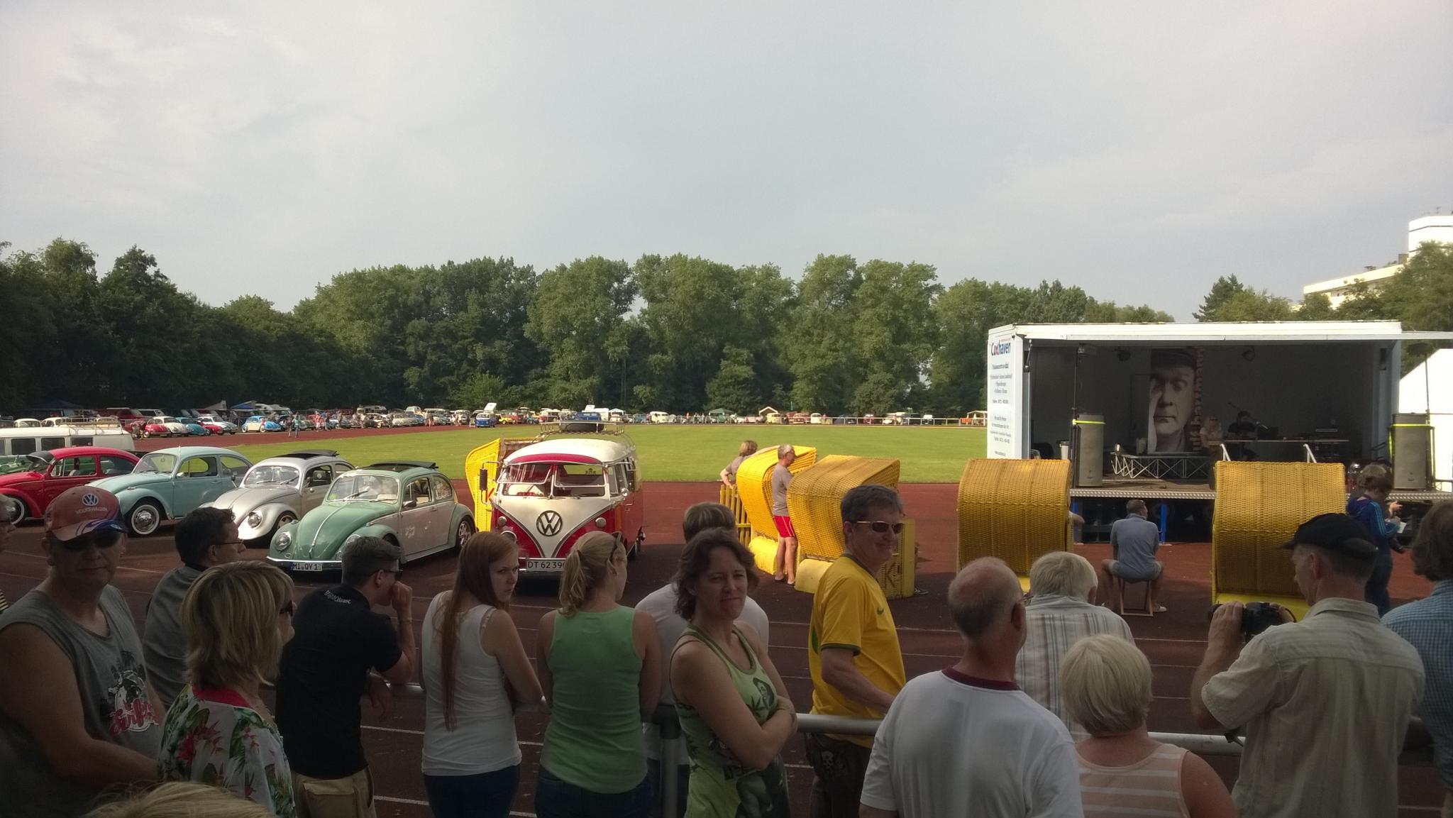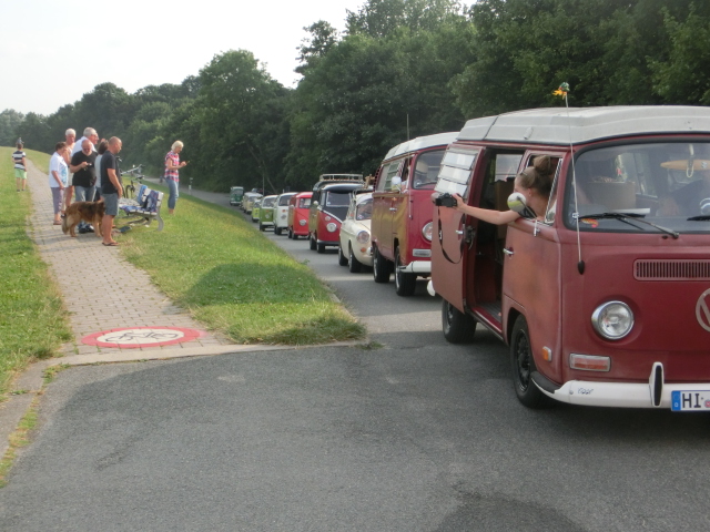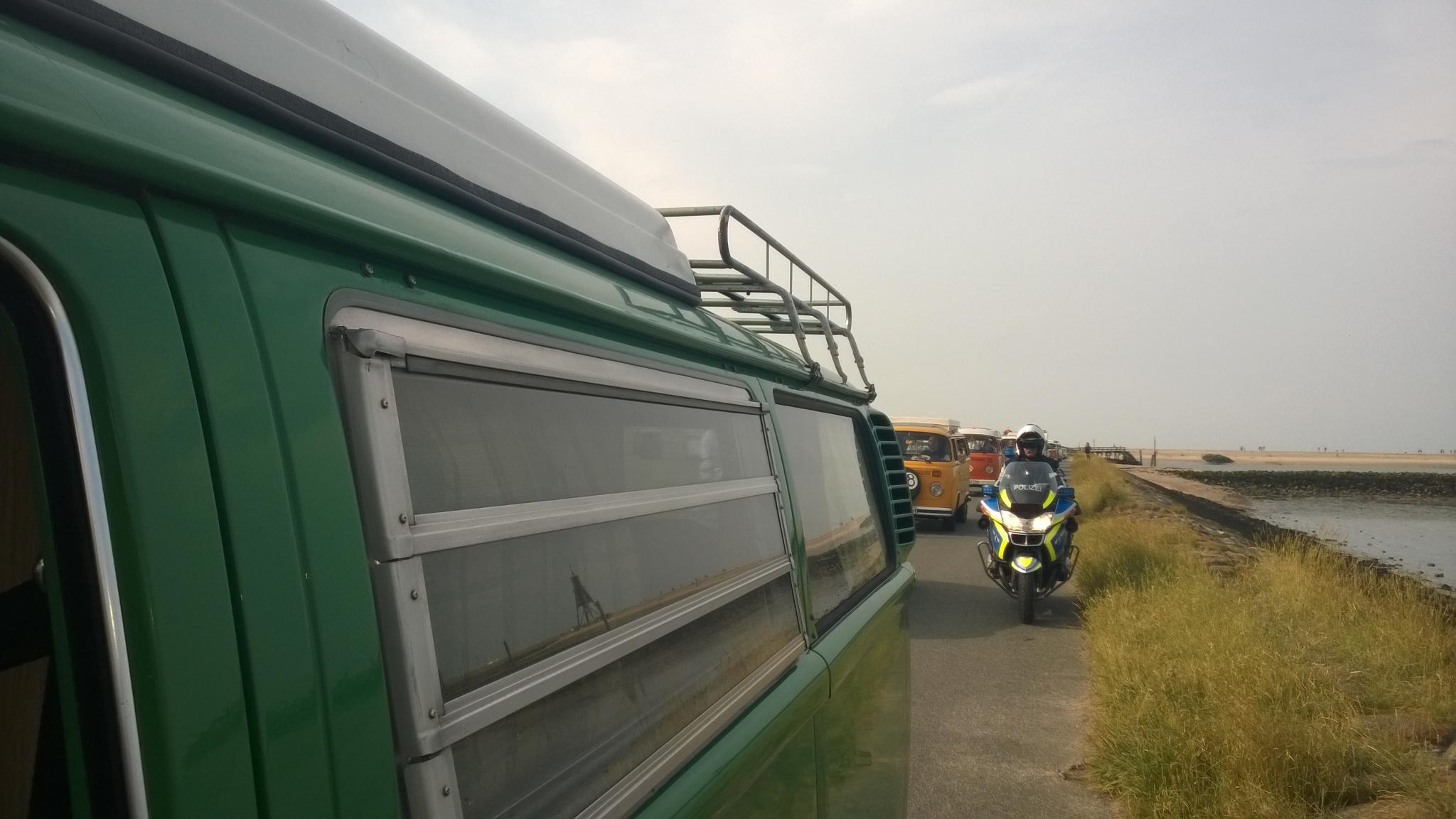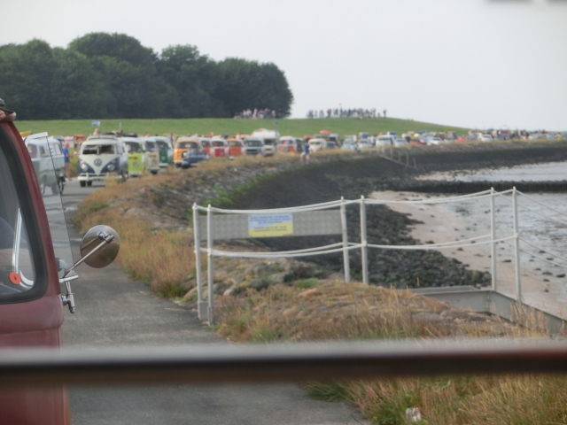 Und dann fing das Sammeln für die Rundfahrt an. Allein schon das Durcheinander auf dem Platz, wenn die Leute ihre Autos anlassen, wenden, sich zueinander finden ist eine Sache für sich. Die Käfer standen nun aber alle hintereinander auf der Laufbahn, ein toller Anblick! Und Sorry, Otterndorf: aber der Pacours durch Cuxhaven ist einfach schon ne riesige Nummer geiler! Die Leute standen an den Straßen, winkten begeistert, klatschten sogar! Wir zogen durch die Stadt und die Stimmung der Zuschauer war spitzenmäßig. Und dann ging es über den Deich, da hatte ich echt Gänsehaut. Links die Nordsee, vor und hinter Dir Bullis, rechts Tausende, die es sich auf den Strandkorbwiesen gemütlich gemacht haben und winkten und klatschen und fotografierten. Hammer. Ganz großes Kompliment an die T3ler, ich hatte heute früh mit einem geschnackt: die meinten, sie hätten das Gesamtbild nicht stören wollen und haben nicht teilgenommen sondern stattdessen auch auf der Wiese gestanden und zugeschaut. Spitzenmäßig. Und dann hielt doch das leitende Auto der Polizei am Ende der Bucht tatsächlich an. Man konnte aussteigen, Fotos machen, die Zuschauer sprachen einen an. Irre. So toll war das noch nie!