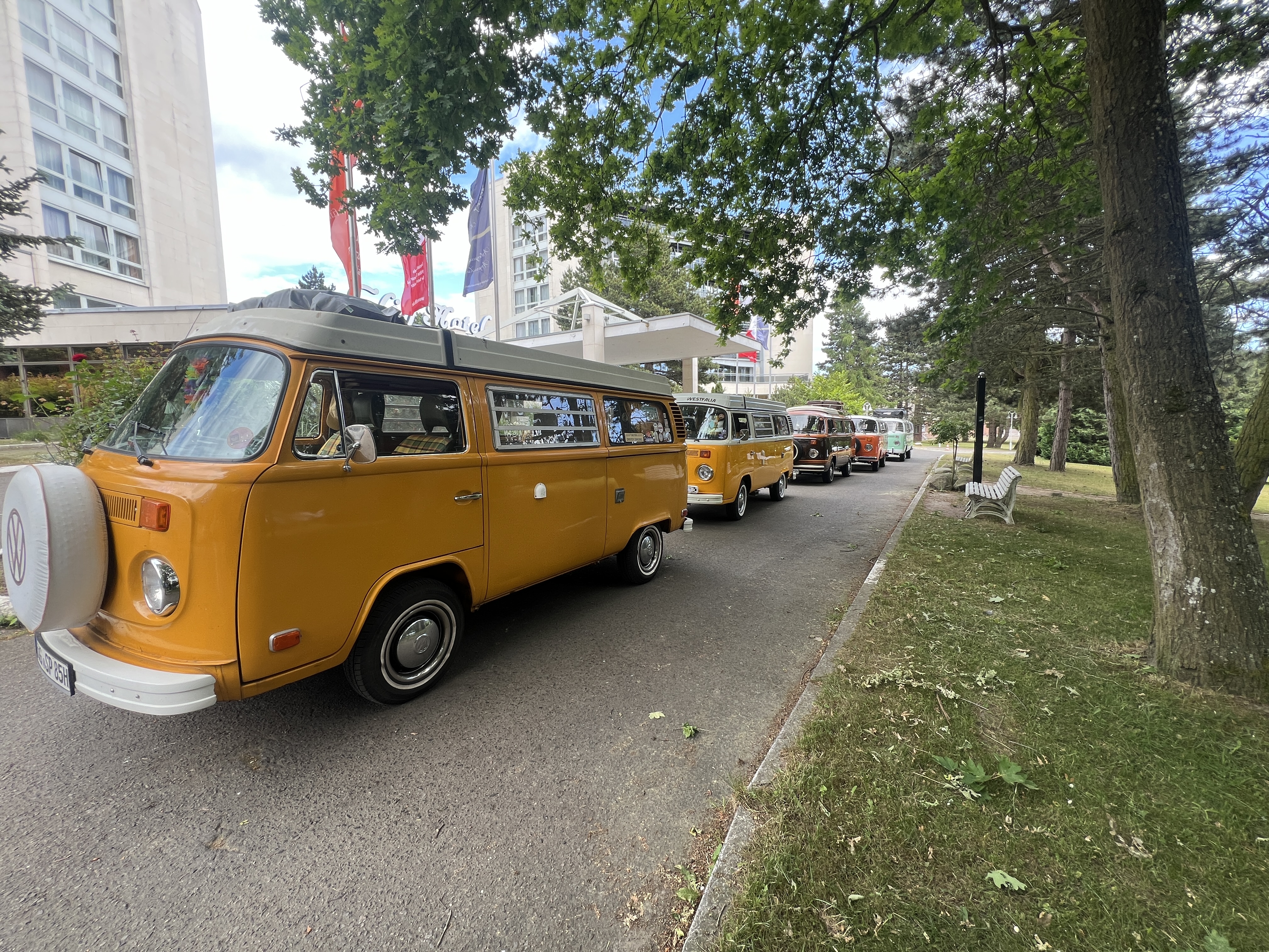 Unsere erste Station auf Rügen war das „Cliff Hotel Rügen“, wo wir gegen 15.00 Uhr eintrafen. Peter hatte für uns einen speziellen, abgesperrten Parkplatz organisiert, was uns ein komfortables Ankommen ermöglichte. Vor dem Hoteleingang versammelten wir uns für einen Fototermin, bei dem nicht nur wir, sondern auch einige interessierte Hotelgäste, die sich über die Hotelpost informiert hatten, unsere Bullis bestaunen konnten.