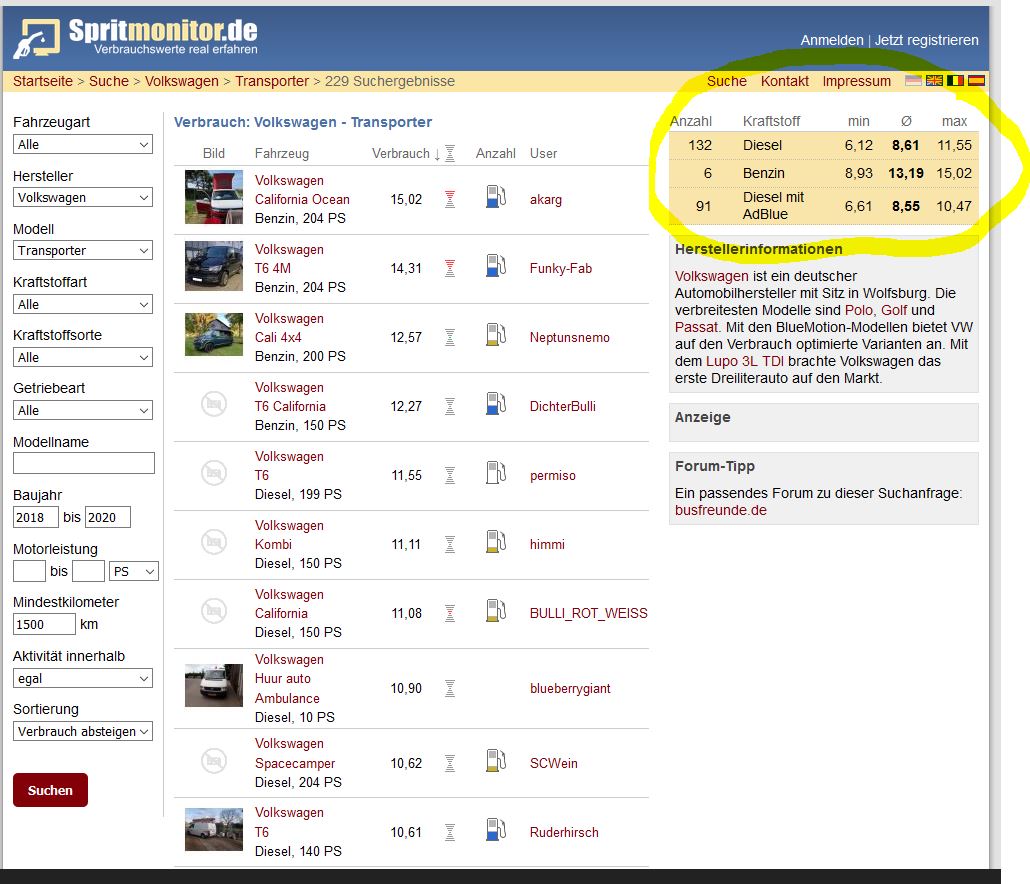 Mein Bulli braucht 8l, mit Wohnwagen 10-11. Ok, ganz anderer Motor, aber da kommt ein moderner Bulli nun wirklich nicht drunter, auch nicht bei gleicher Fahrweise, es sein den wir fangen an diesem gegen Benzin zu vergleichen