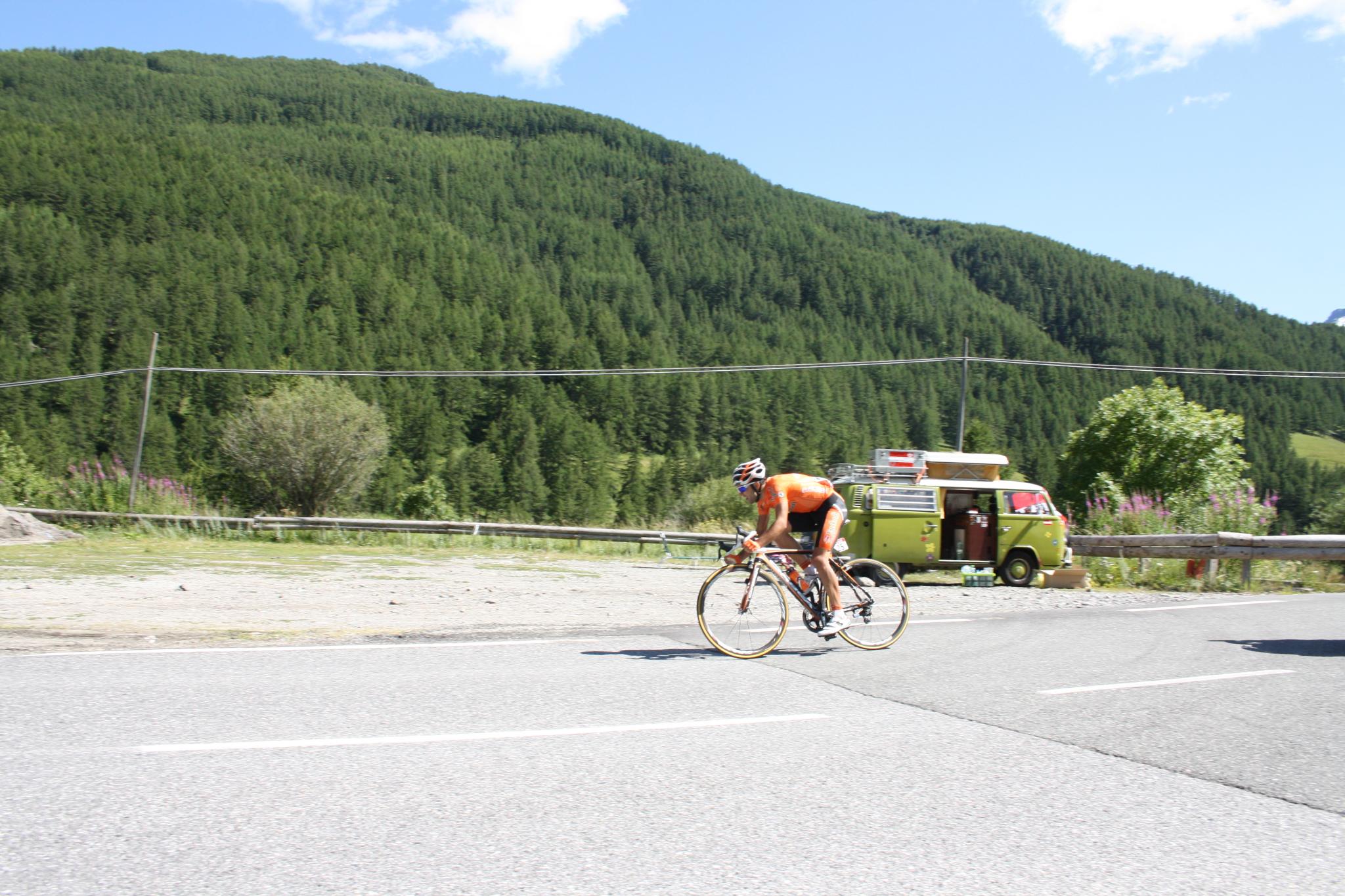 und dann erst die Rennradler, hier der führende wie er gerade unseren Bus passiert :wink: