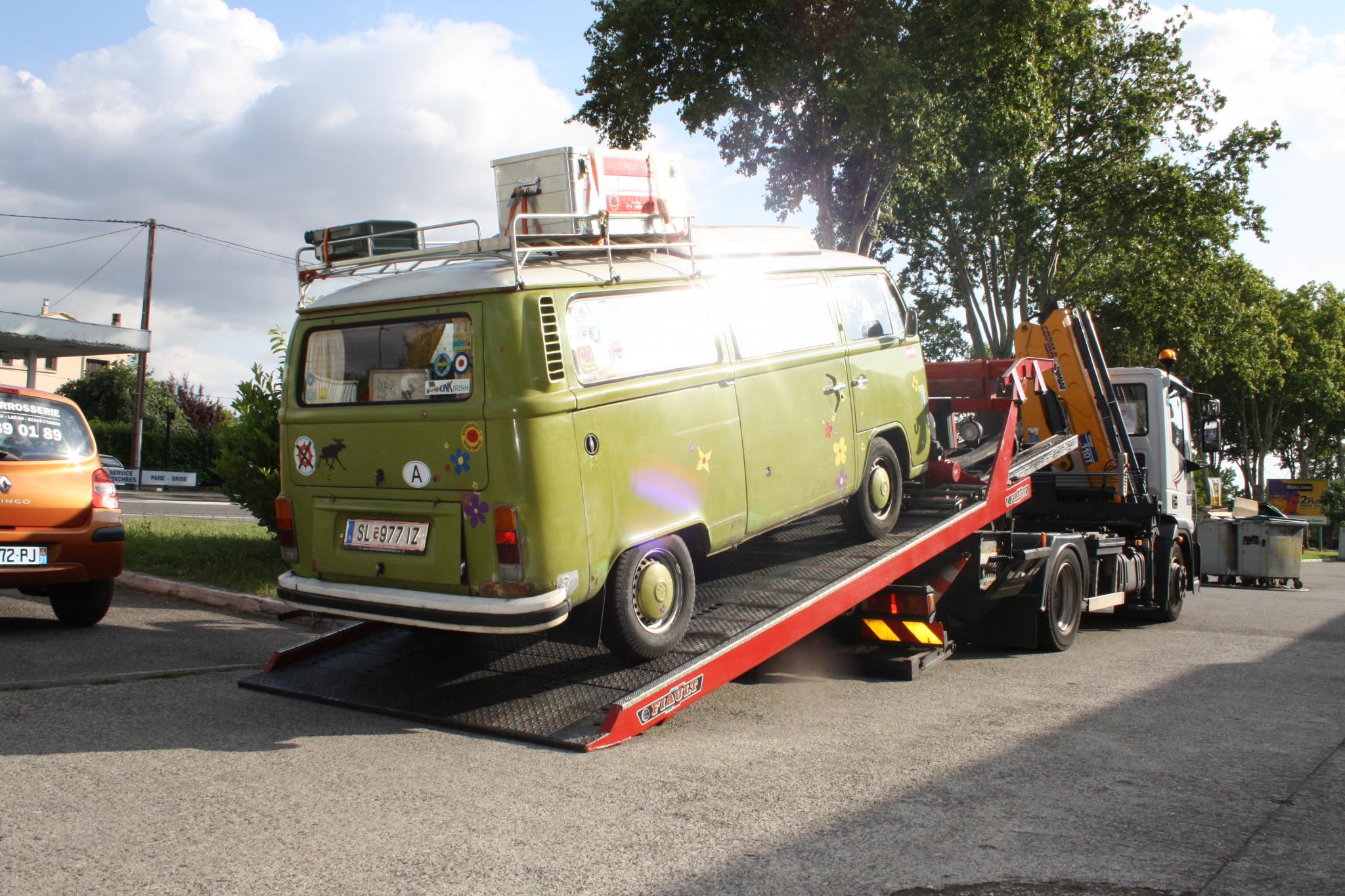Der Abschlepper wollte uns nicht zur 40km entfernten VW-Käfer&Bus Werkstätte bringen, obwohl wir vom ÖAMTC das OK für die Kostenübernahme des Transportes dorthin bekommen hatten. :?
