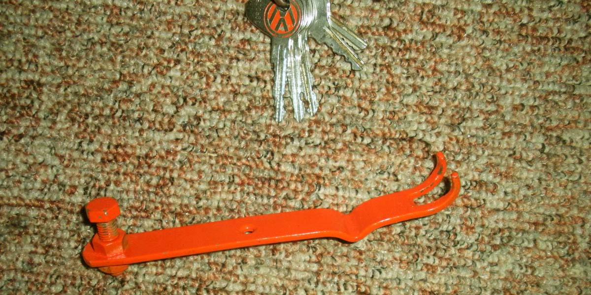Mit dem gabelartigen Ende lässte es sich leicht unter den pilzartigen Teil der Verriegelung einhängen. Die Heckklappe kann dann an der Schraube normal verriegelt werden. Durch die gebogene Form der Gabel sitzt nach dem Abschliessen alles fest und lässt sich auch nicht abziehen oder öffnen.