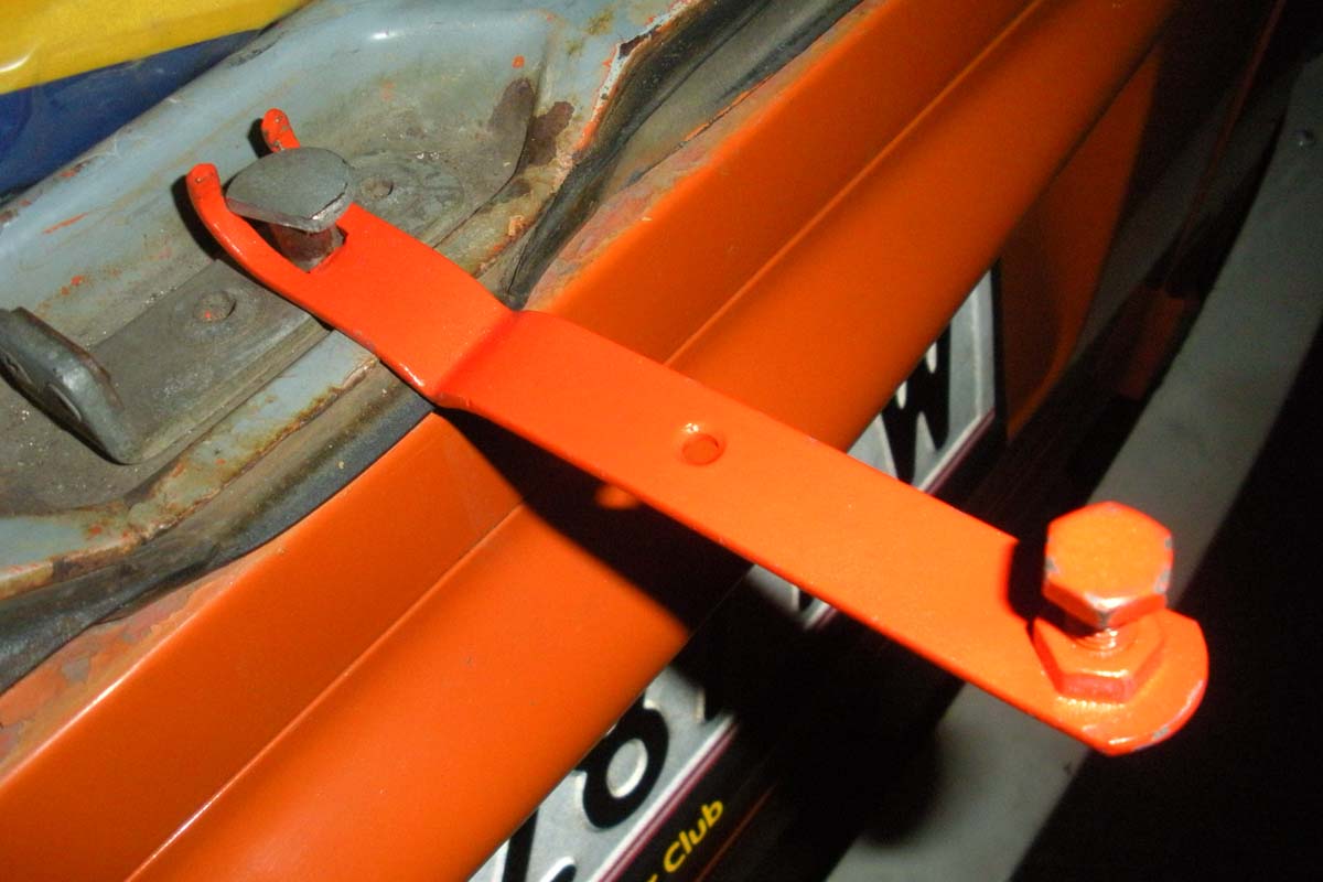 Das Teil ist ein einfacher Eisenwinkel aus dem Baumarkt den ich flachgeklopft habe (jedes andere Stück Flacheisen tut's auch, hatte damals aber gerade keines bei der Hand), auf einer Seite gabelartig eingeschnitten und aufgebogen, auf der anderen Seite ein Loch aufgebohrt und eine Schraube im Durchmesser der Heckklappenverriegelung mit 2 Muttern festgemacht (Superkleber auf's Gewinde, dann geht's auch nur mit Brachialgewalt wieder auf).