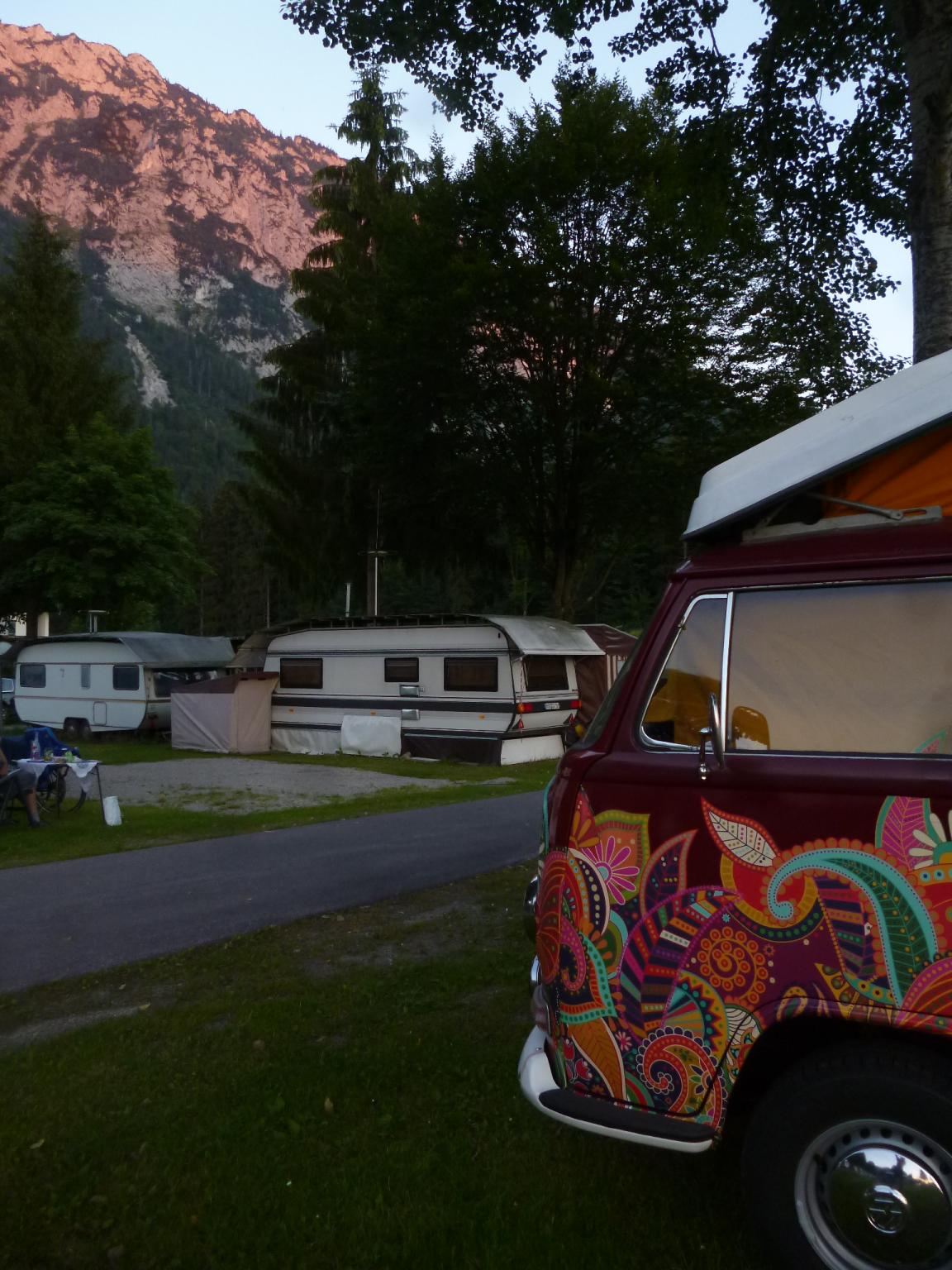 argwöhnisch wurde diese bunte Kiste beäugt und dieser Langhaarige Tätowierte Bombenleger, der sein Vordach mit Indischen Tüchern und Bunten Handtücher behängte