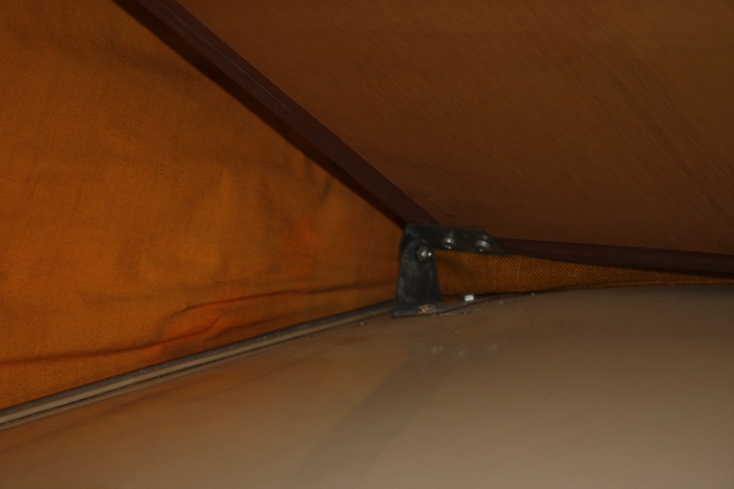 Die Rundung des Daches wird durch die Gumminoppen ausgeglichen (Man sieht die Abdrücke / Verformungen auf dem Dach ganz deutlich). Links und Rechts liegt das auf den Winkeln. Das Kopfende kann durch den klappbaren Winkel hochgeklappt werden. Ganz vorne ist noch so ne Stoffwurst eingeklemmt.