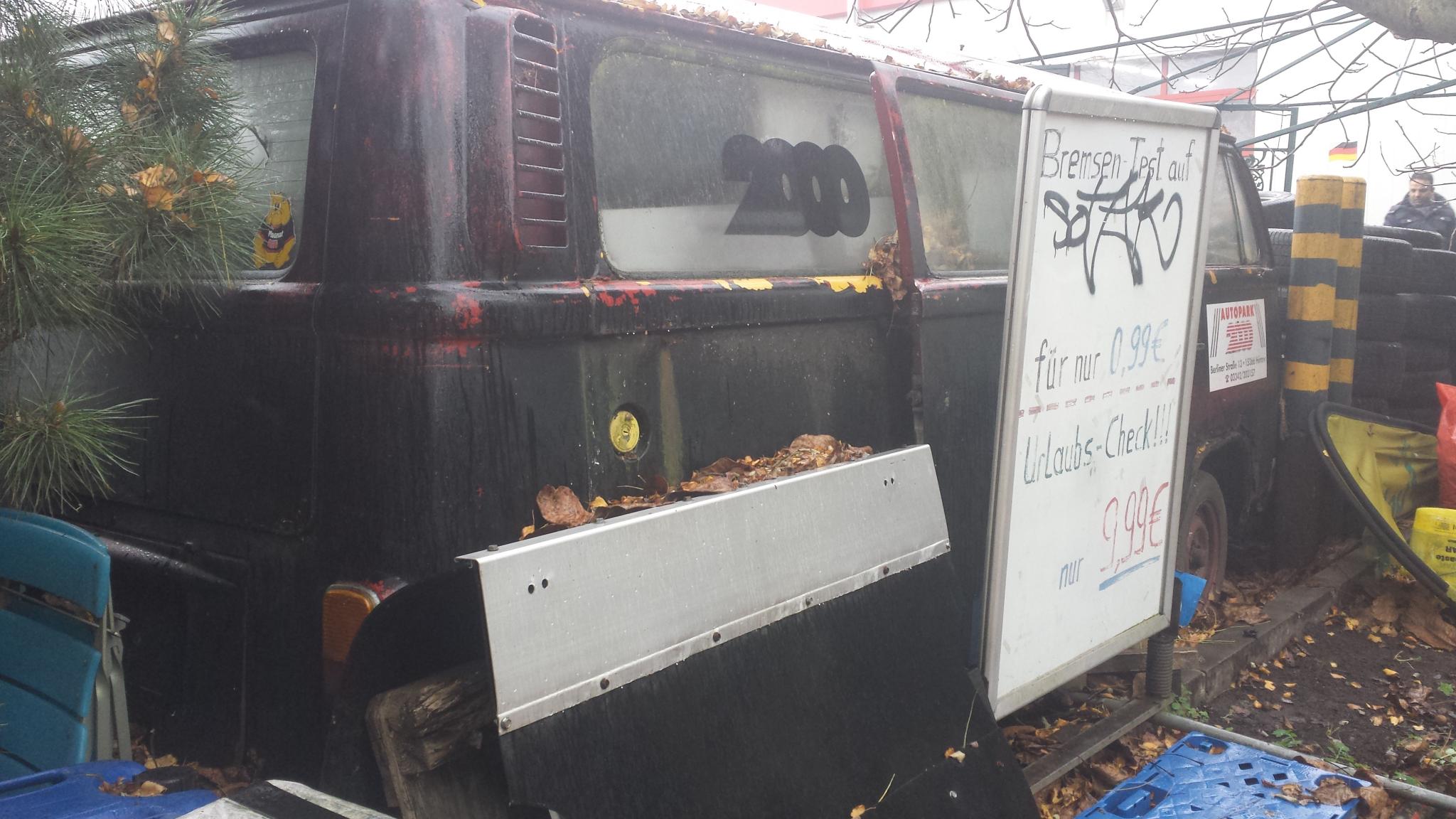 Nett find ich aber den Werbeaufsteller, den er jetzt (wohl eher unabsichtlich) daneben gestellt hat. Das sollte er mal so als Werbepaket vor seine Werkstatt stellen.