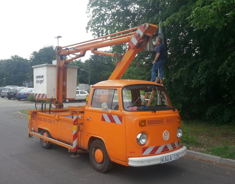 Aus dem W123-Forum von einem netten Kollegen abgelichtet - T2-Ruthmann-Steieger mit unreflektierendem DIN-Schild und im Alltagseinsatz