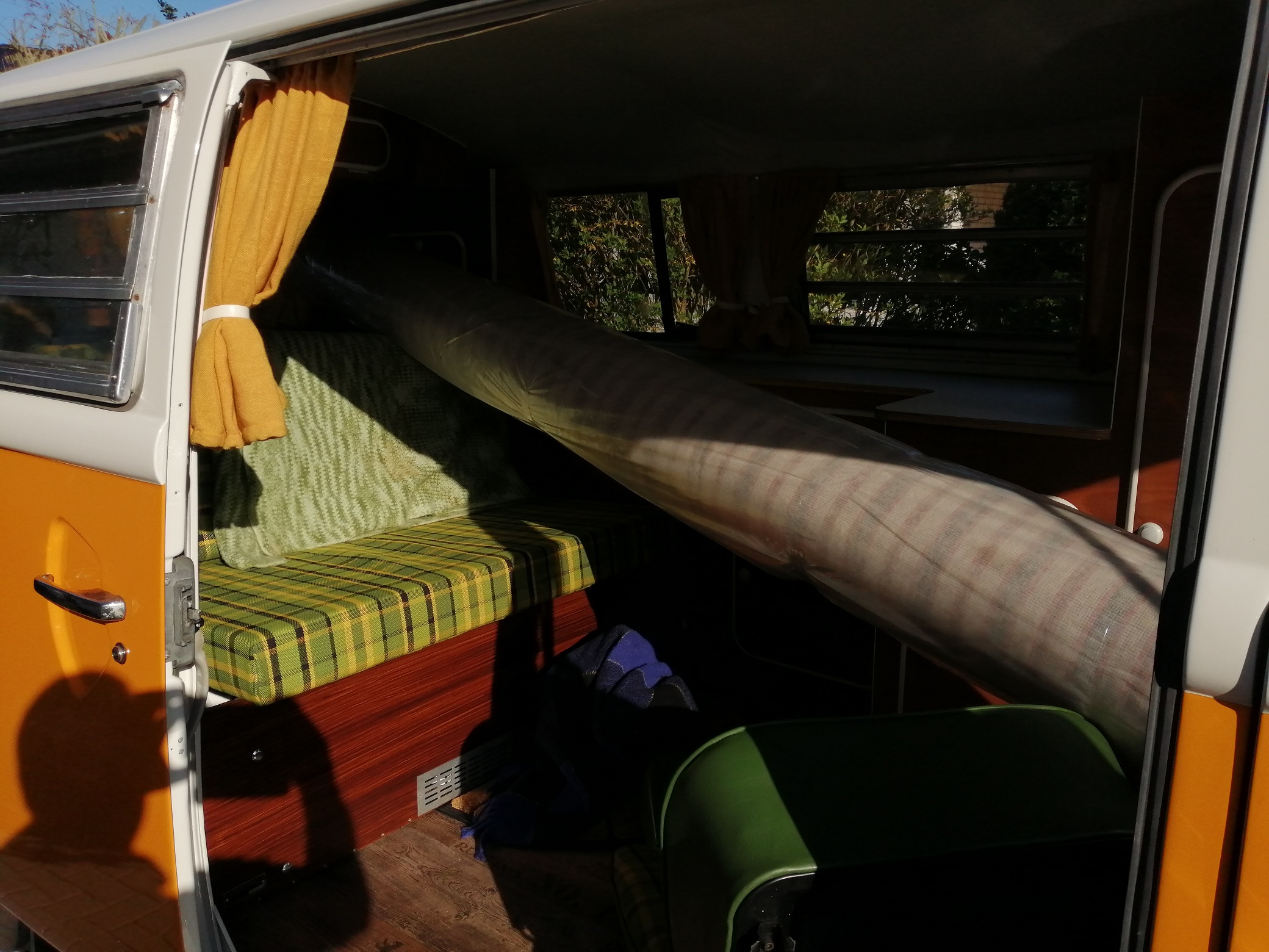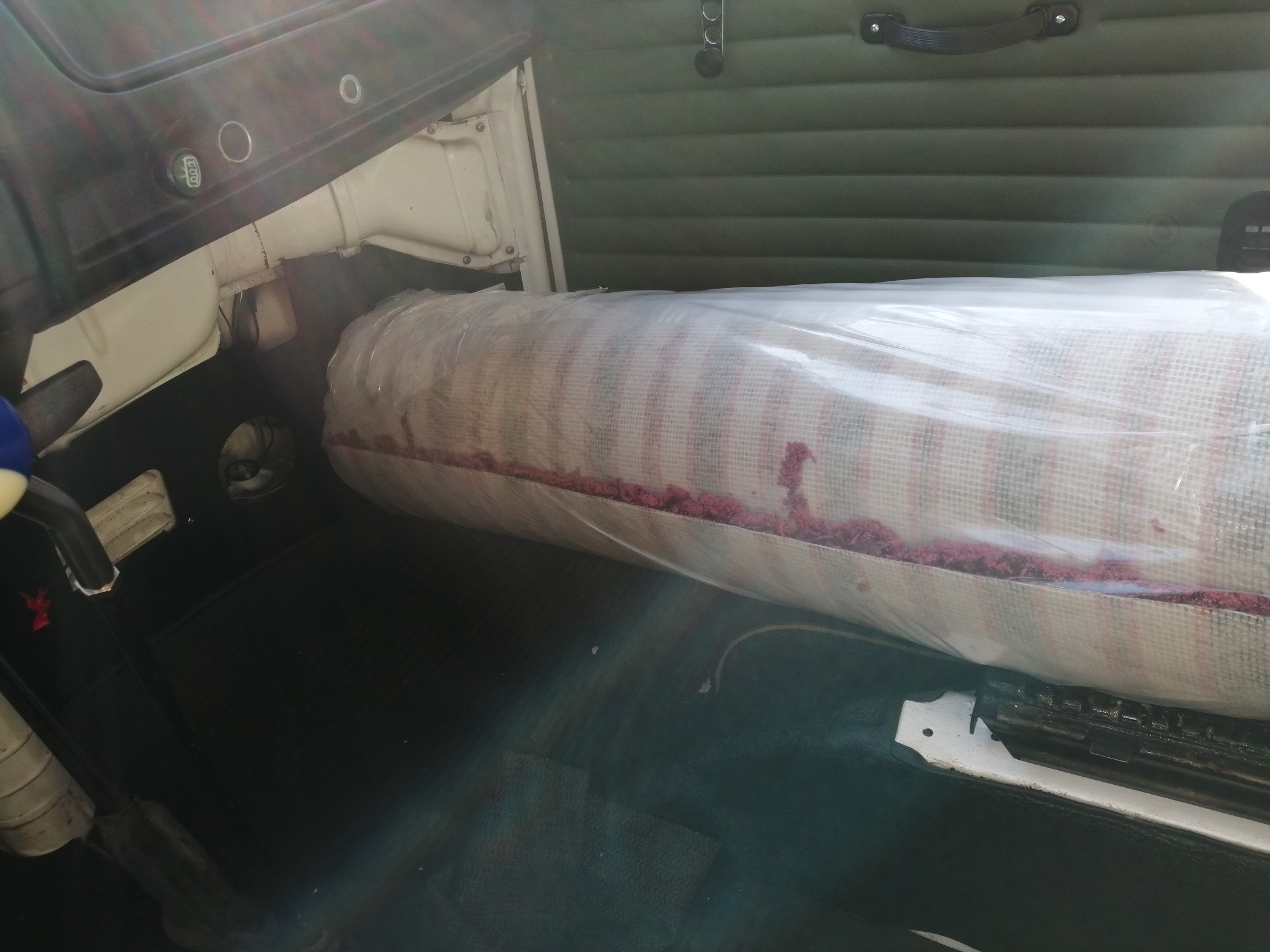 heute haben wir den neuen Teppich (400 cm breit und 430 lang) für das Schlafzimmer von Hammer mit unserem Westfalia-Kombi abgeholt. Sollte mit gedrehtem Beifahrersitz möglich sein, war es aber nicht.