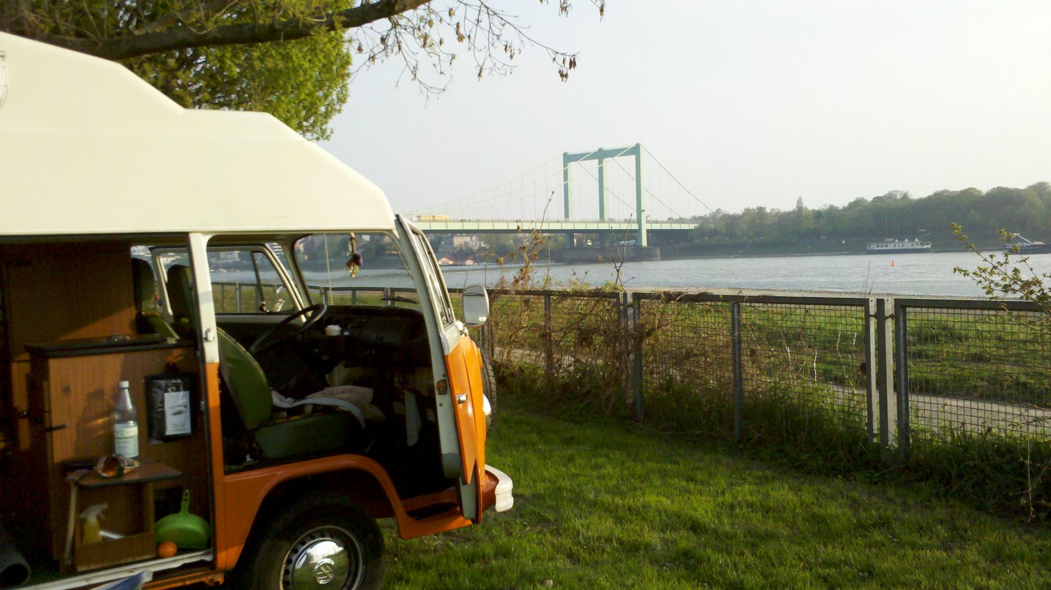 Wach geworden mit Blick auf vorbeituckernde Rheinschiffe und kurz darauf den ersten Kaffee in der Busküche gekocht.