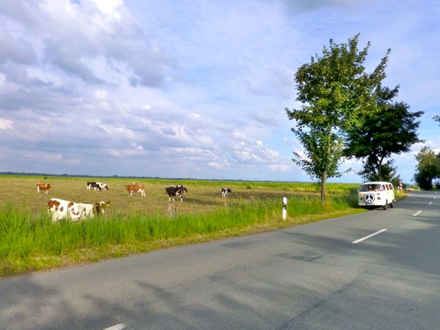Allein unter lauter Rindviechern in friedlicher Absicht. Gleich hinterm Weserdeich vor der Fähre Sandstedt.