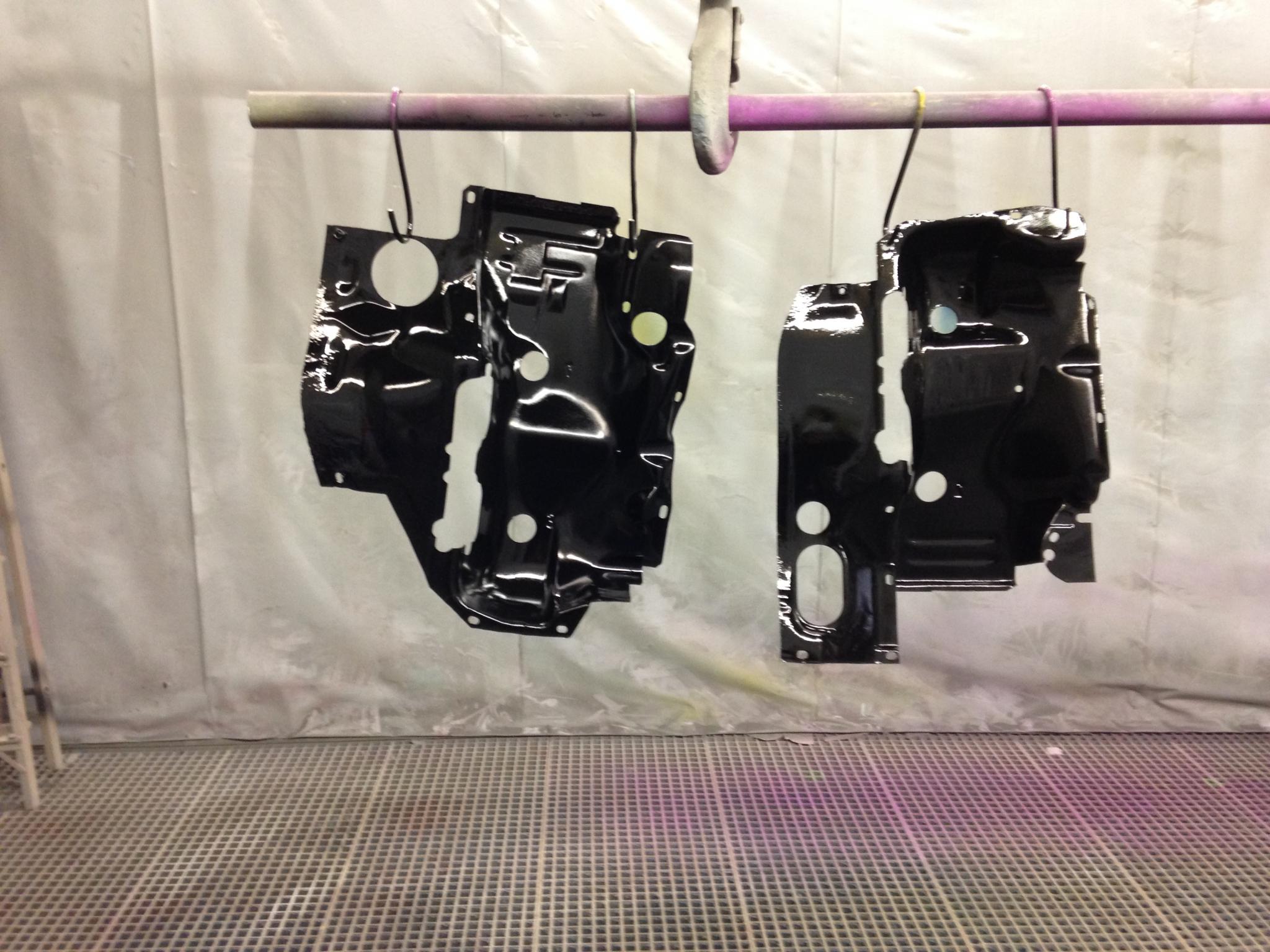 Hier ist meine Motorblech gerade fertig... Glasperl gestrahlt, 2k grundiert, LKW Schwarz 2k lackiert.... fehlt eine Teil, das Teile direct vor der Lufter, war zu verrostet, wird mit eine Edelstahlteil mit Integrierthitzeschild von Ralfs VW Teile ersetzt...
